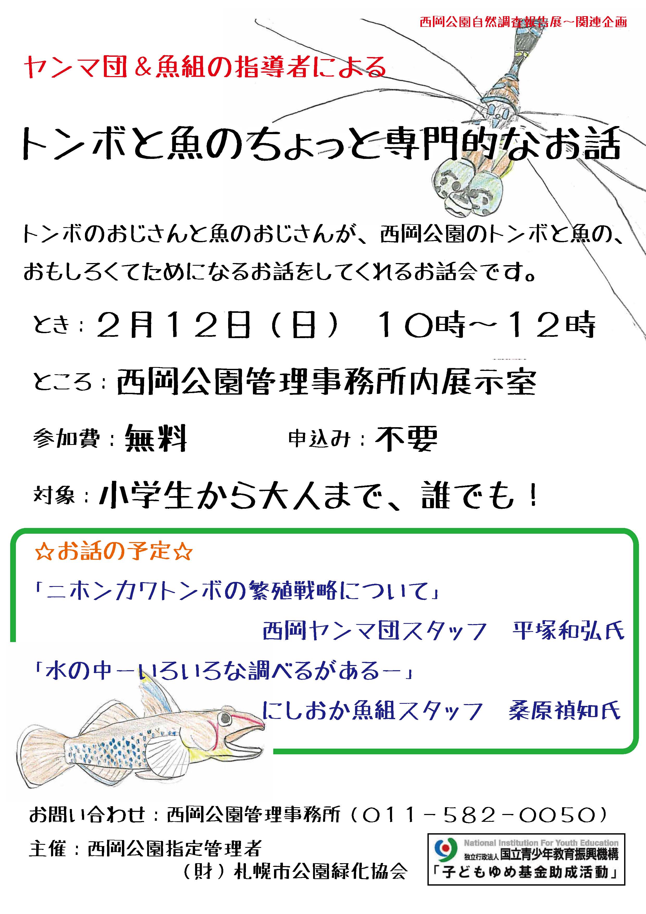 2月12日に、西岡公園管理事務所で、講演会「トンボと魚のちょっと専門的なお話」 を行います。 ヤンマ団と魚組の指導者である、トンボと魚のおじさんが、ちょっと専門的だけど 楽しいお話をしてくれますよ。 ヤンマ団や魚組の子ども達に向けたお話ですが、トンボや魚に興味がある大人から 小学生まで、誰でも楽しめる講演会なので、ぜひご参加ください。 申し込みも参加費も不要なので、お気軽にご参加くださいね。 皆様のご参加、お待ちしています♪