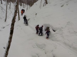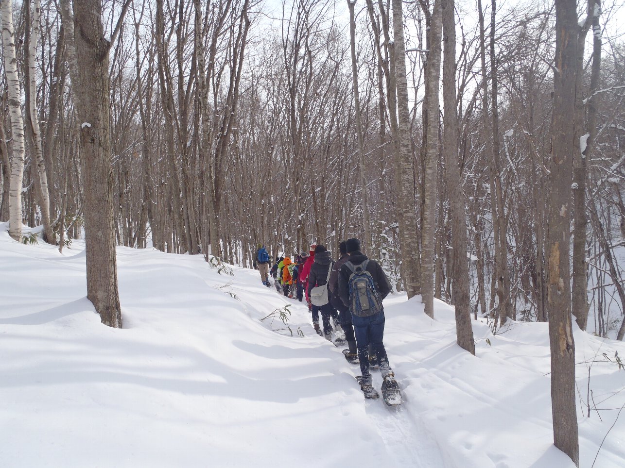山部川分岐点までは、沢を越えたり急斜面を歩いたりしなければいけない場所があります。初めてスノーシューを履く方もて斜面で足が滑ってしまったり、歩きにそうにしていましたが、一人も怪我をすることなく全員が無事に目的地に到着しました。