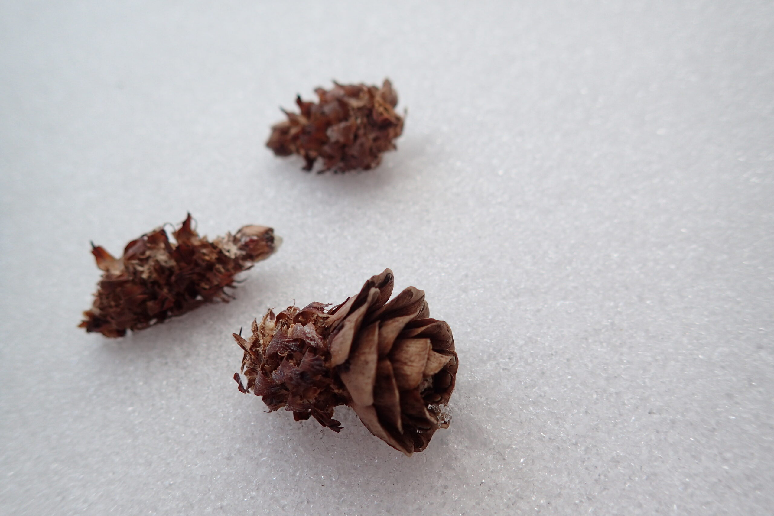 雪の上にはカラマツの種鱗も周りに散乱しています。