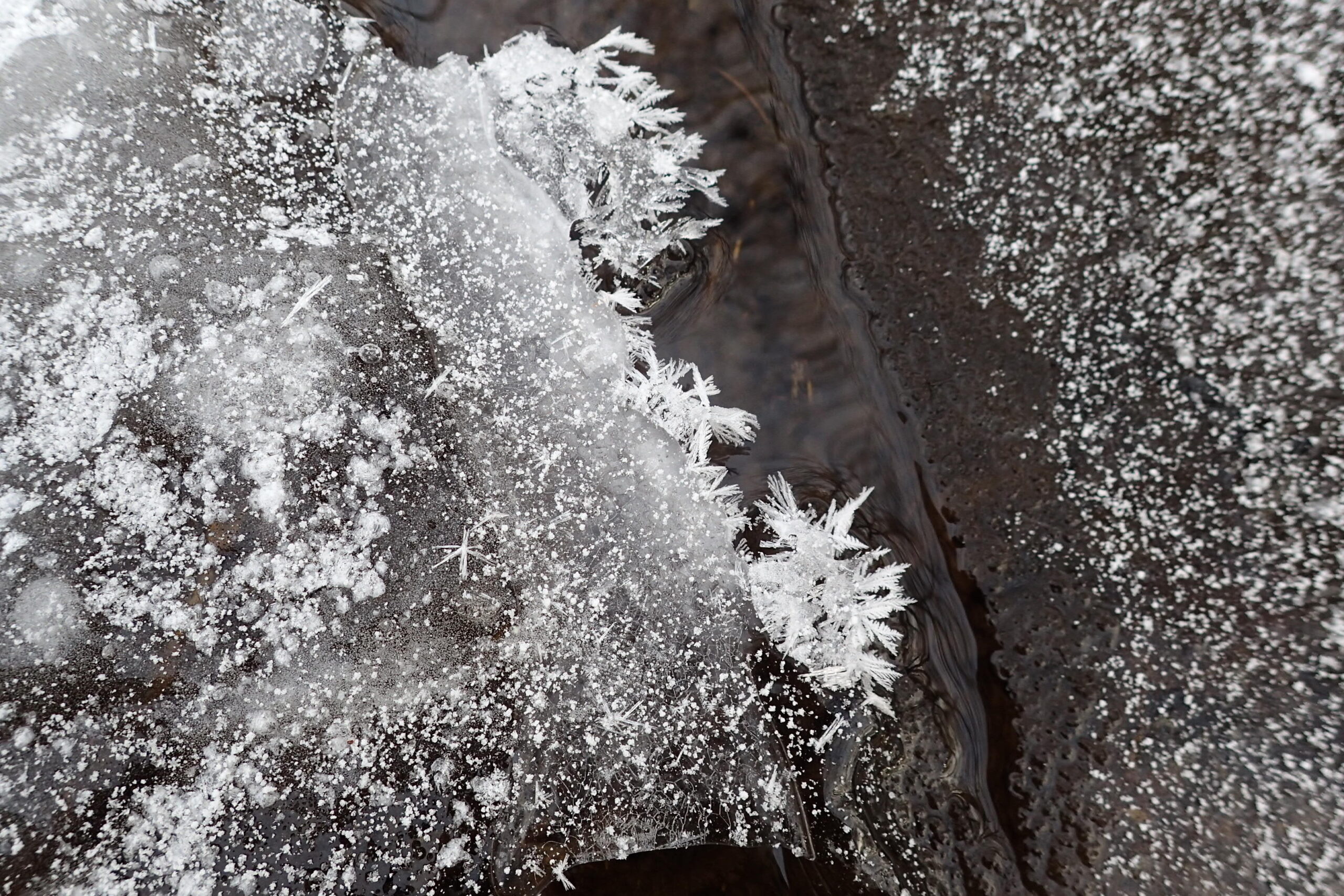 薄氷の上に水蒸気が凍り、花のような結晶が付く現象です。