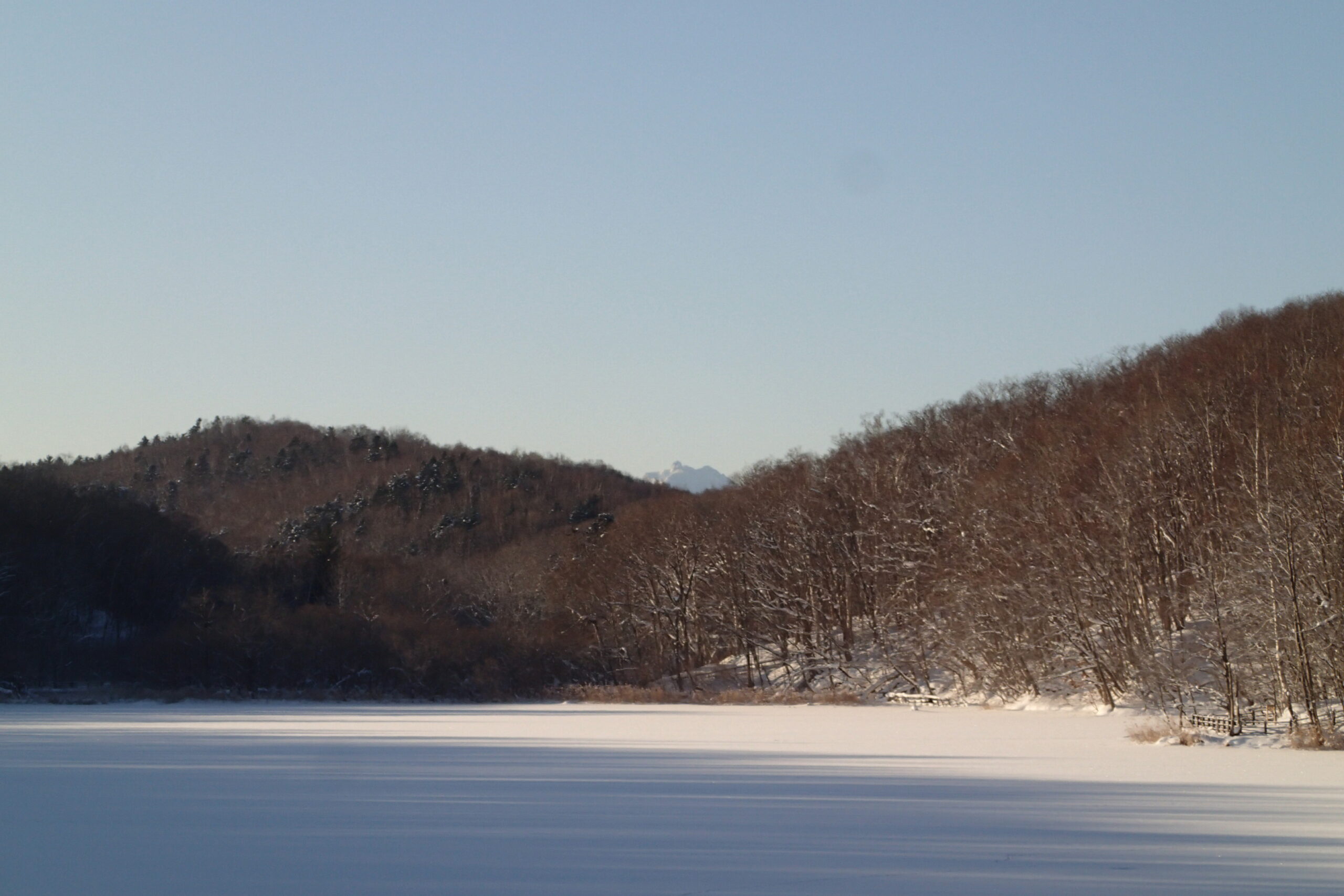 青空が広がり、白い雪に覆われた池も湿原も、とても眩しいです。