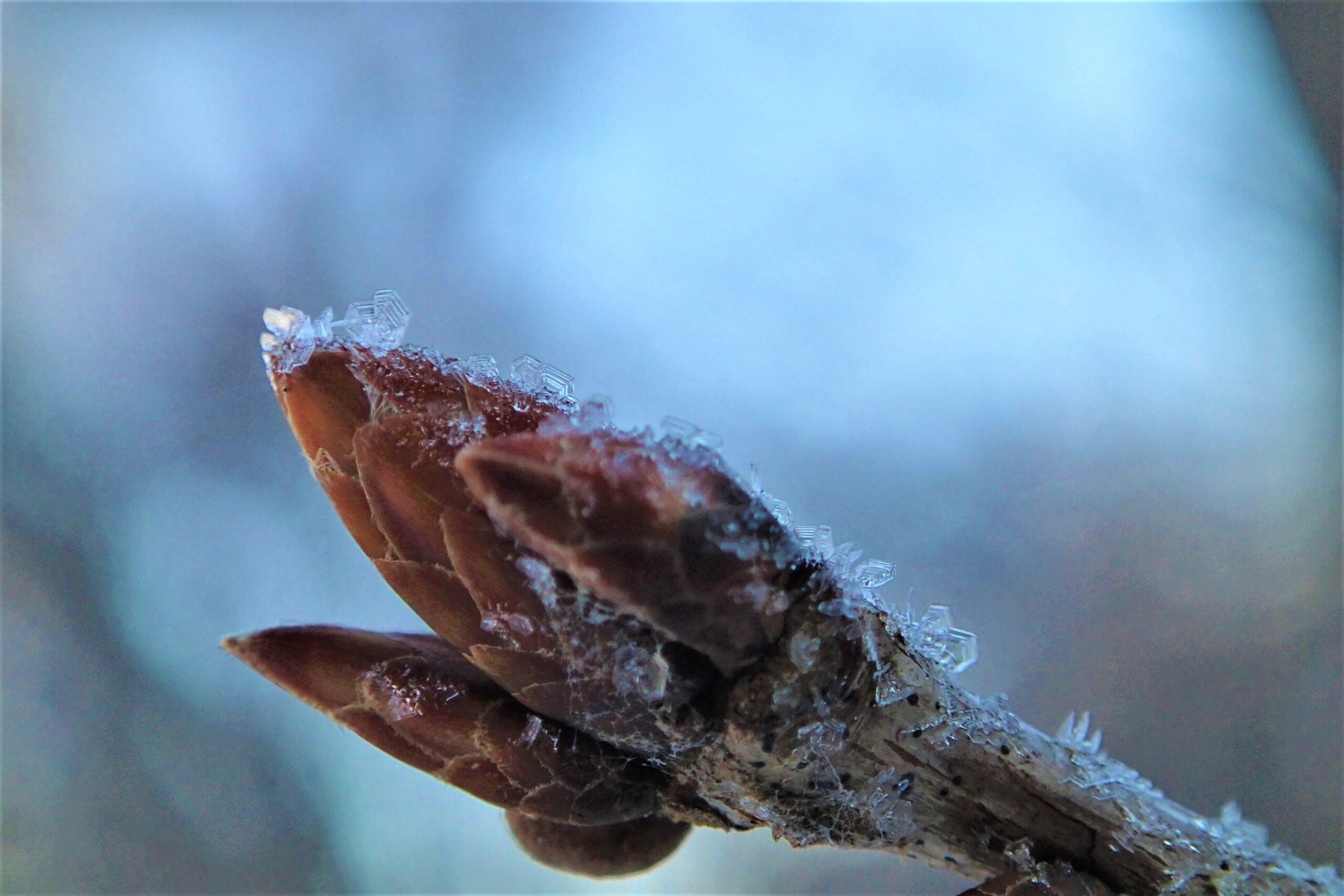 ミズナラの冬芽にも樹霜がついていましたよ。氷の結晶が見えます。