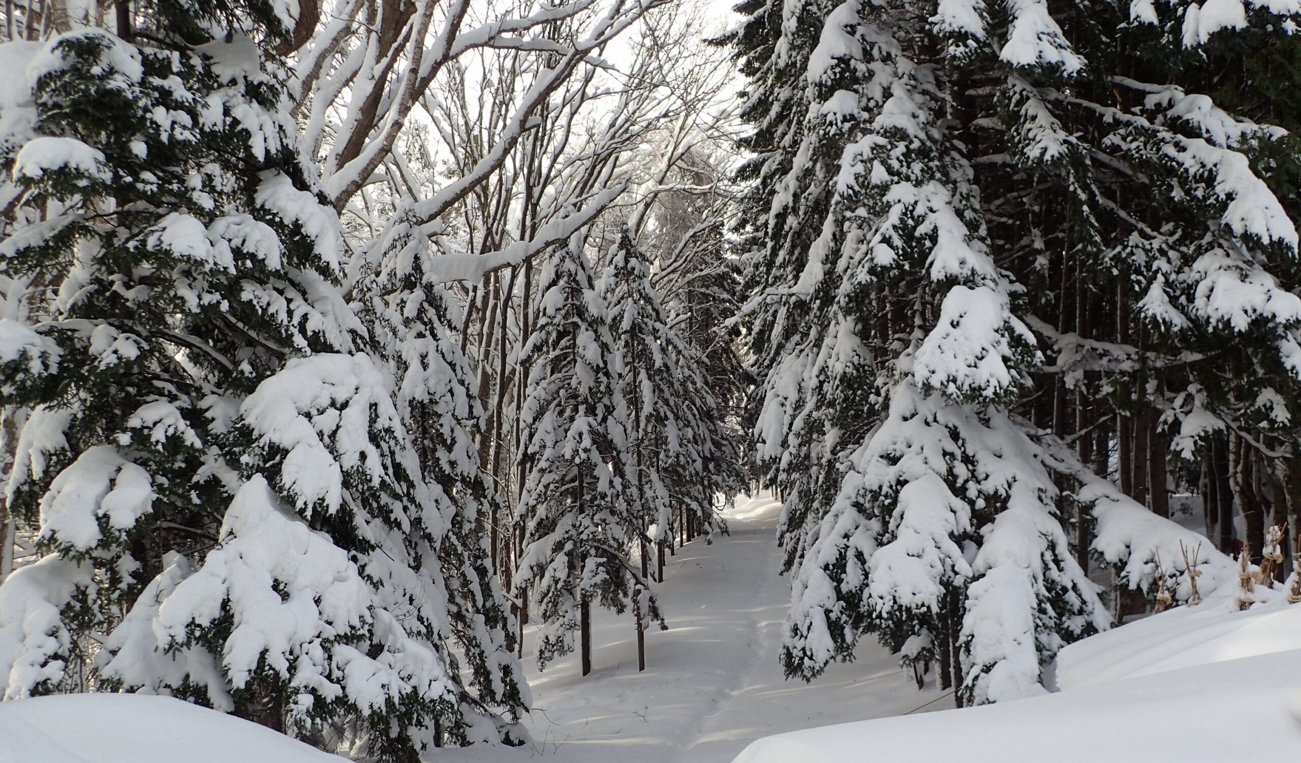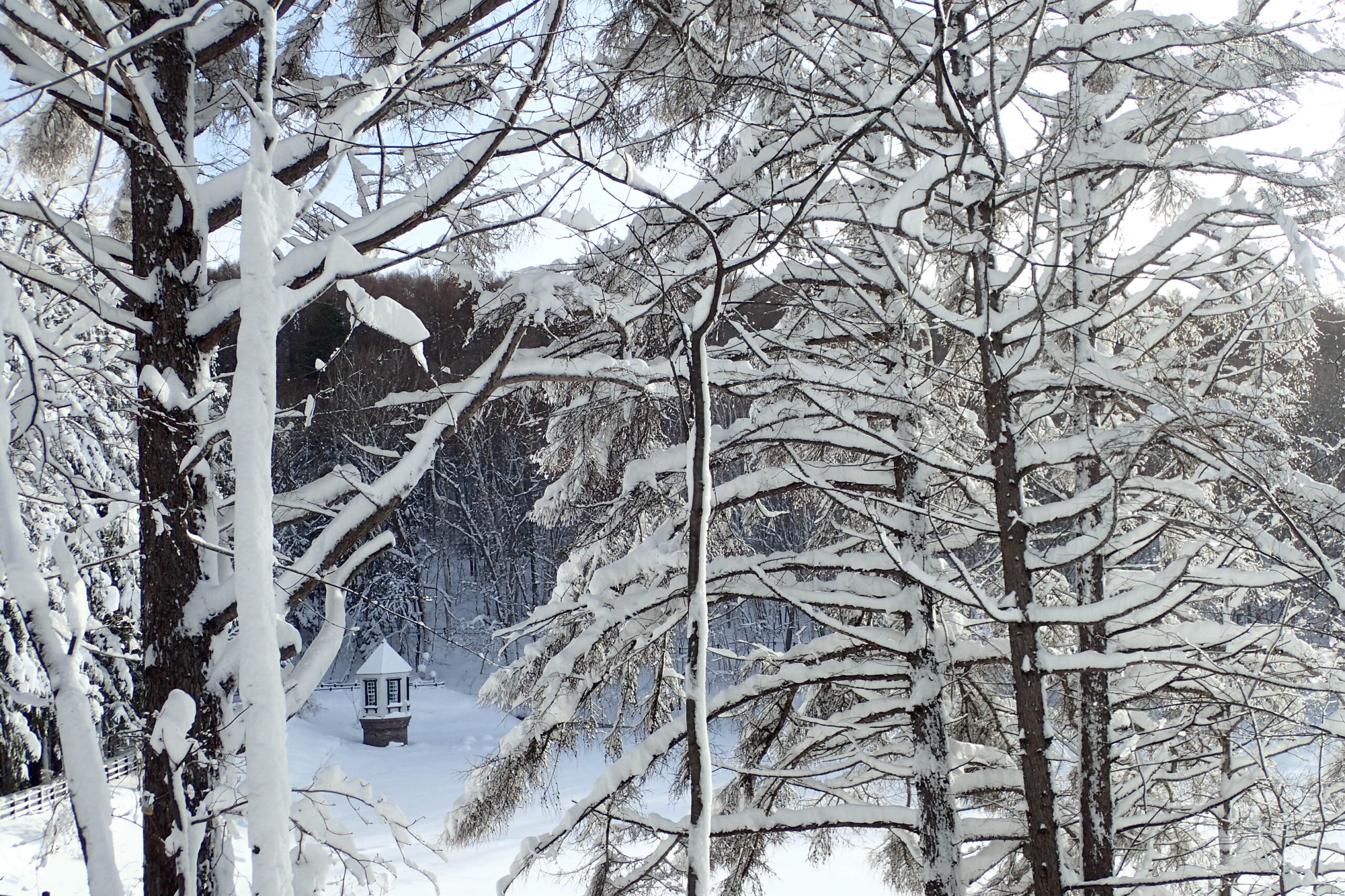 池や森の中、管理事務所の周りも雪が深く、枝の上にもたくさん雪がついています。
