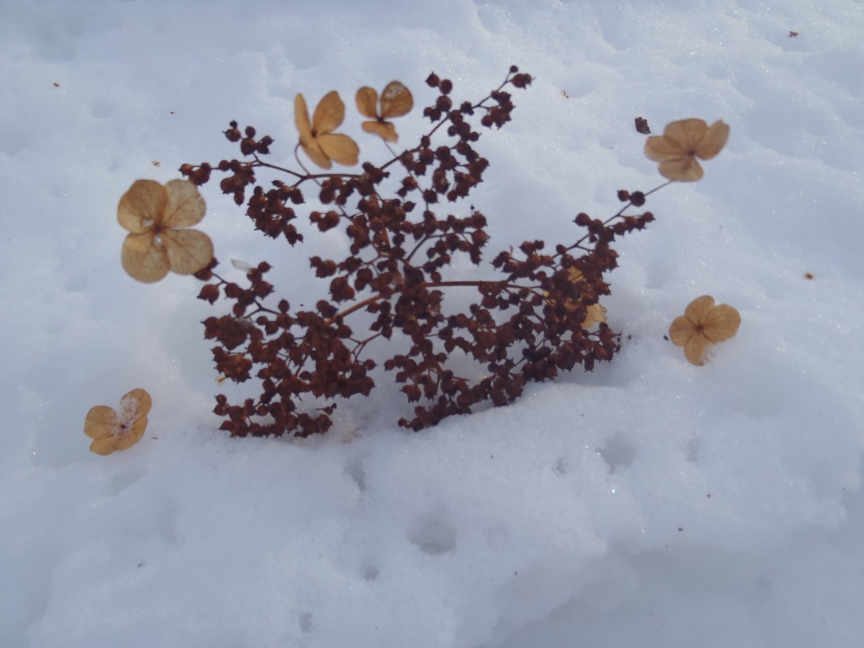 ツルアジサイのドライフラワーは、この時期になると、よく雪の上に落ちています。 似た種類に、イワガラミがありますが、こちらは装飾花の花びらが1枚なので、 見分けることができます。 夏に咲く白い花もきれいですが、雪の上の茶色く乾燥したドライフラワーも、とてもシックで、素敵ですよ。