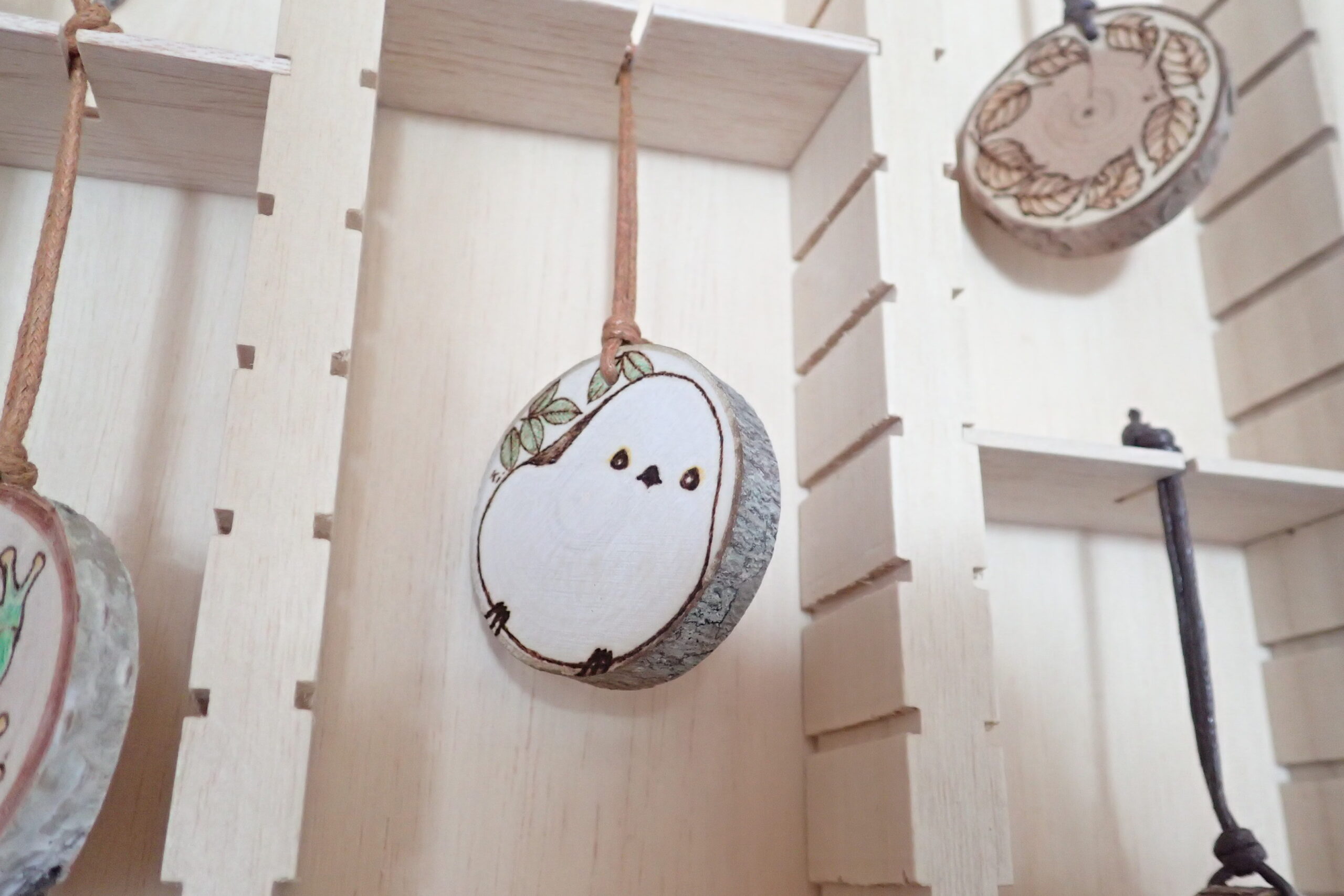 冬の森のアイドル、シマエナガの木製のストラップが入荷しましたよ。繊細にバーニングペンで描かれ、彩色されています。