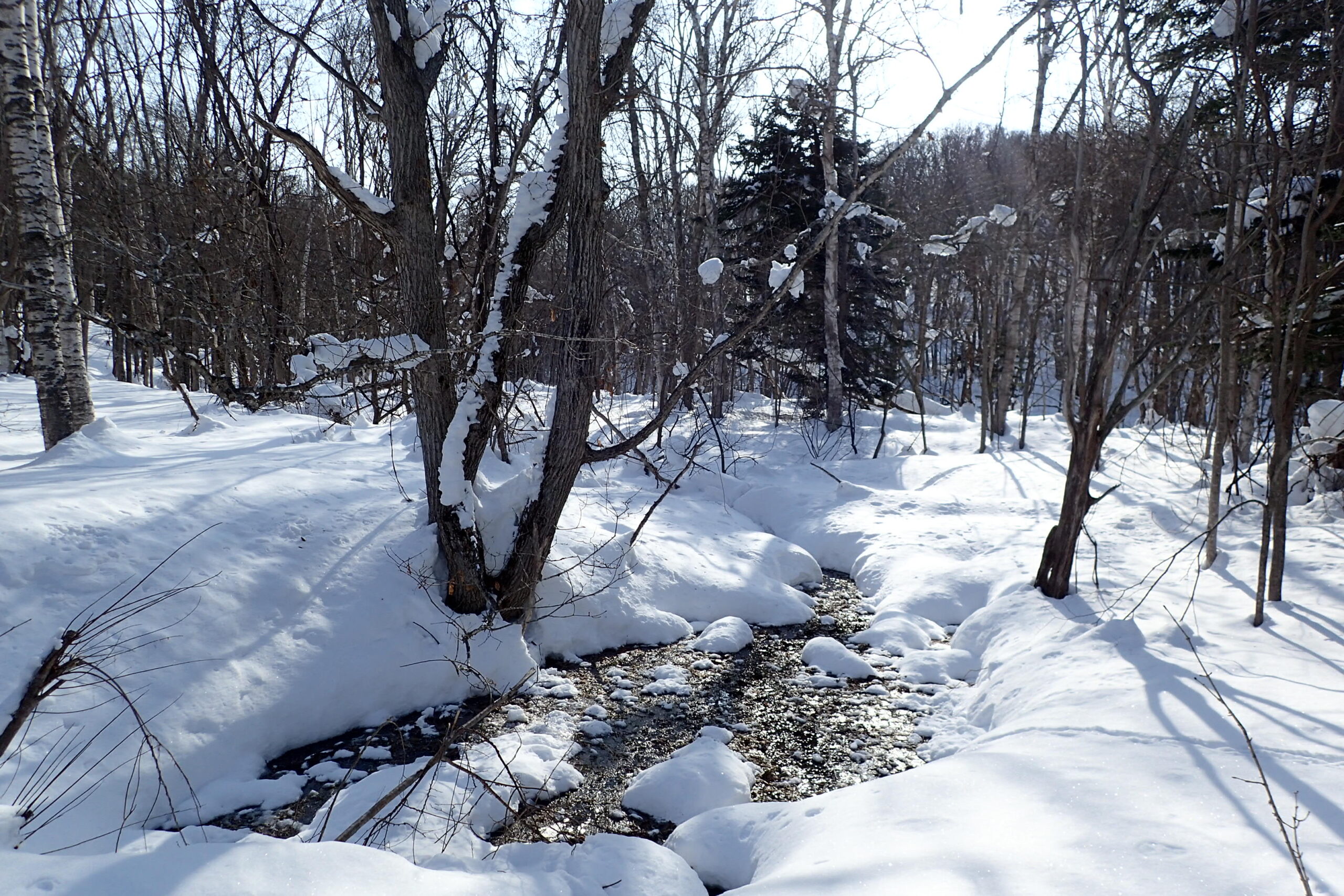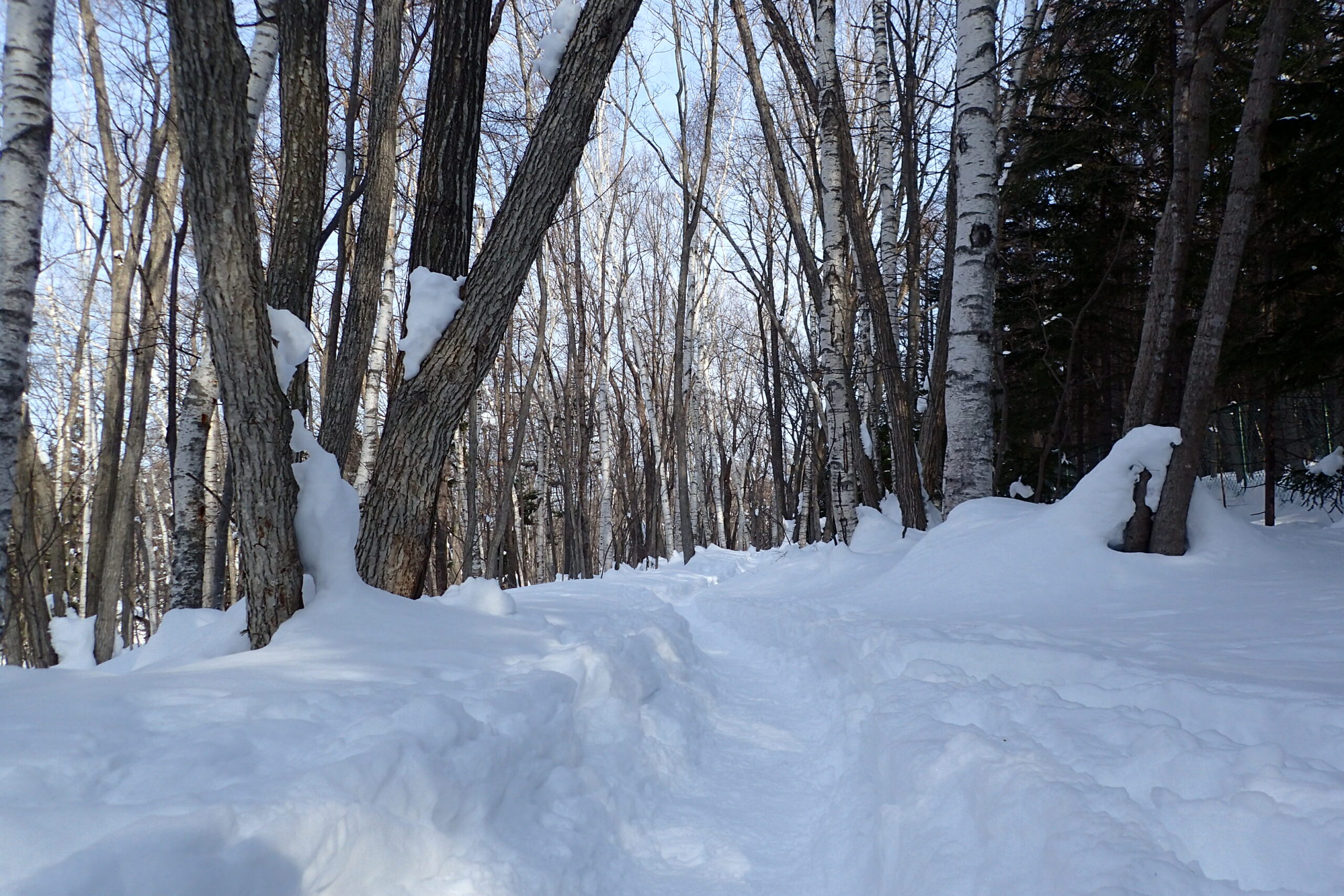 森の中の園路は雪が深く、人が通った後が細く続いています。