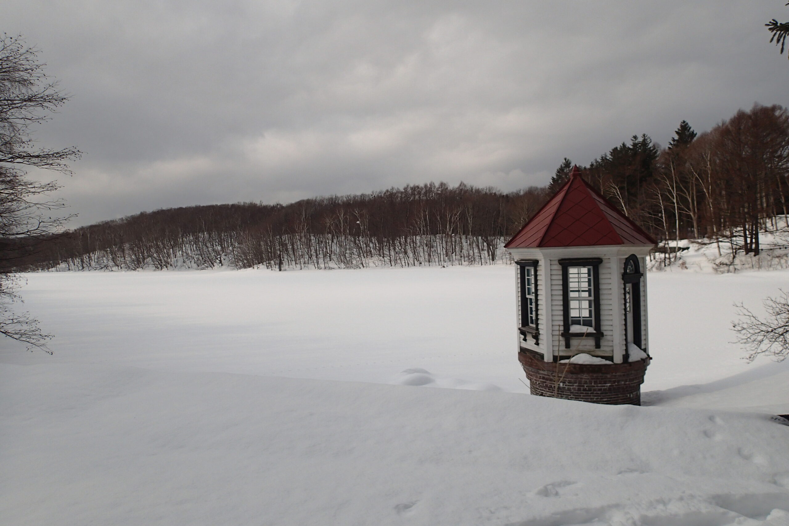 取水塔の向こうに広がる池はまだまだ雪に覆われています。
