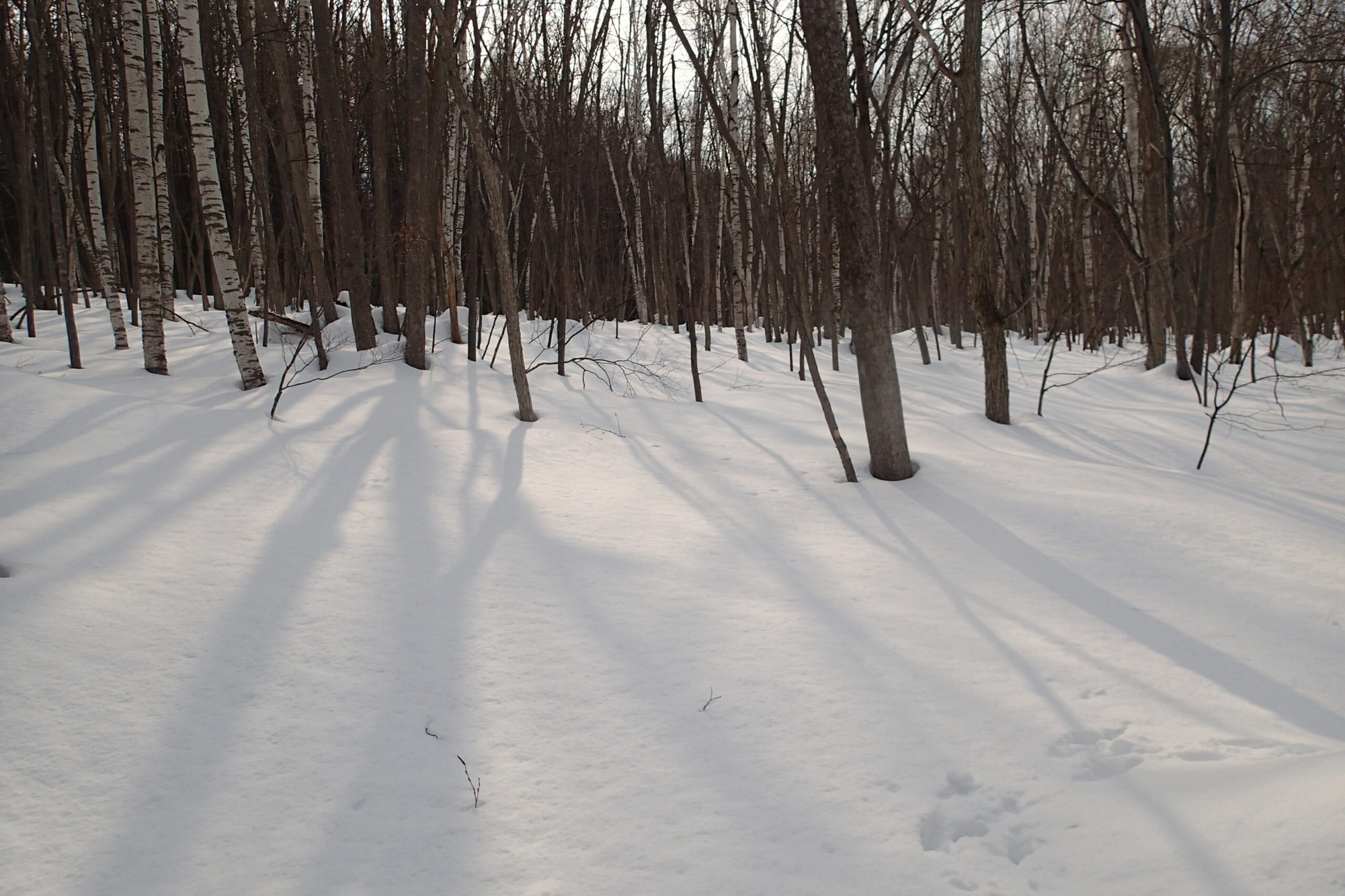 日が差すと、森の中の雪の上には木々の影が長く伸びます。