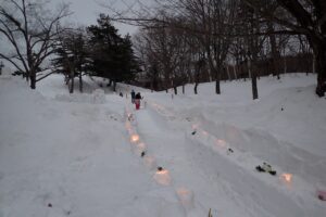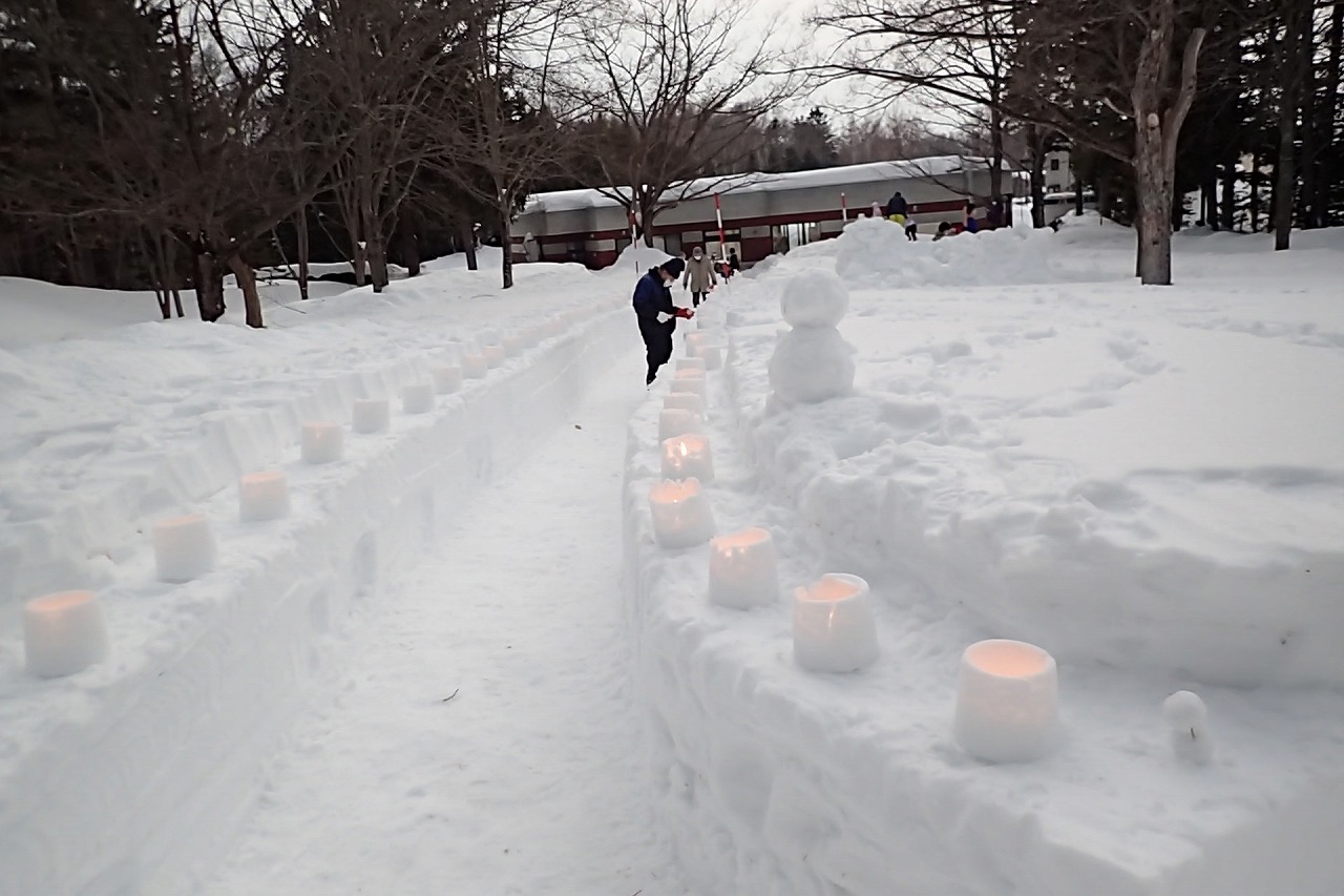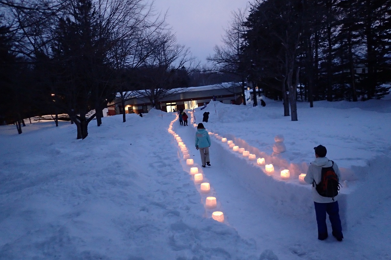暗くなり始めるとスノーキャンドルの灯りが目立ち、