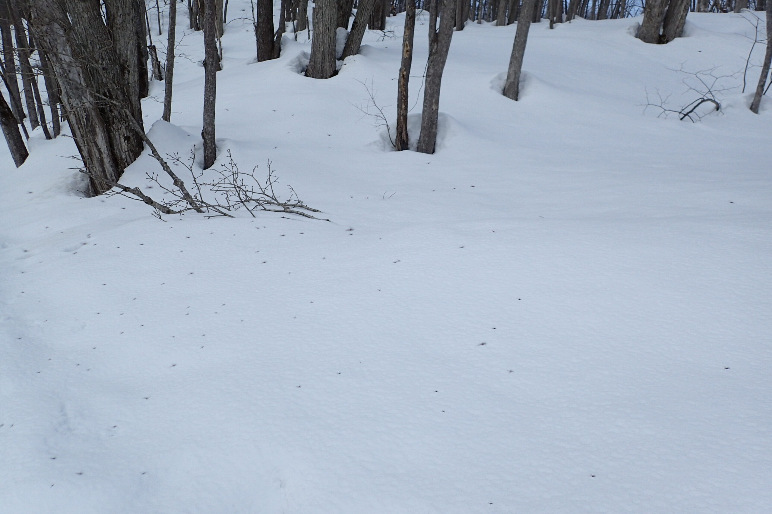 雪の上を魚の群れみたいにユスリカの仲間が群れになって飛んでいます。近づくと離れてくれました。