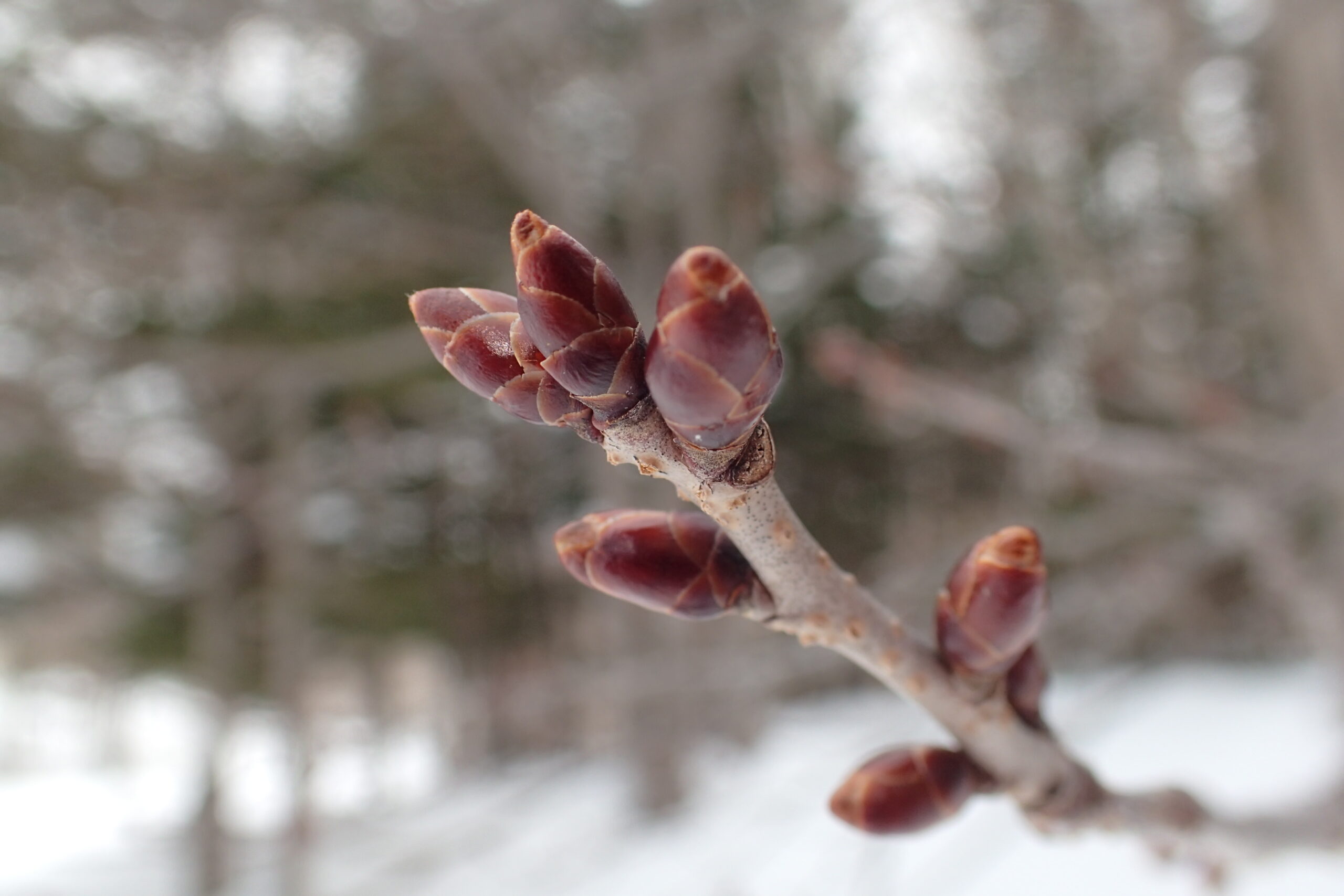 エゾヤマザクラの膨らんだ冬芽をみつけましたよ。去年は5月の上旬に咲きました。