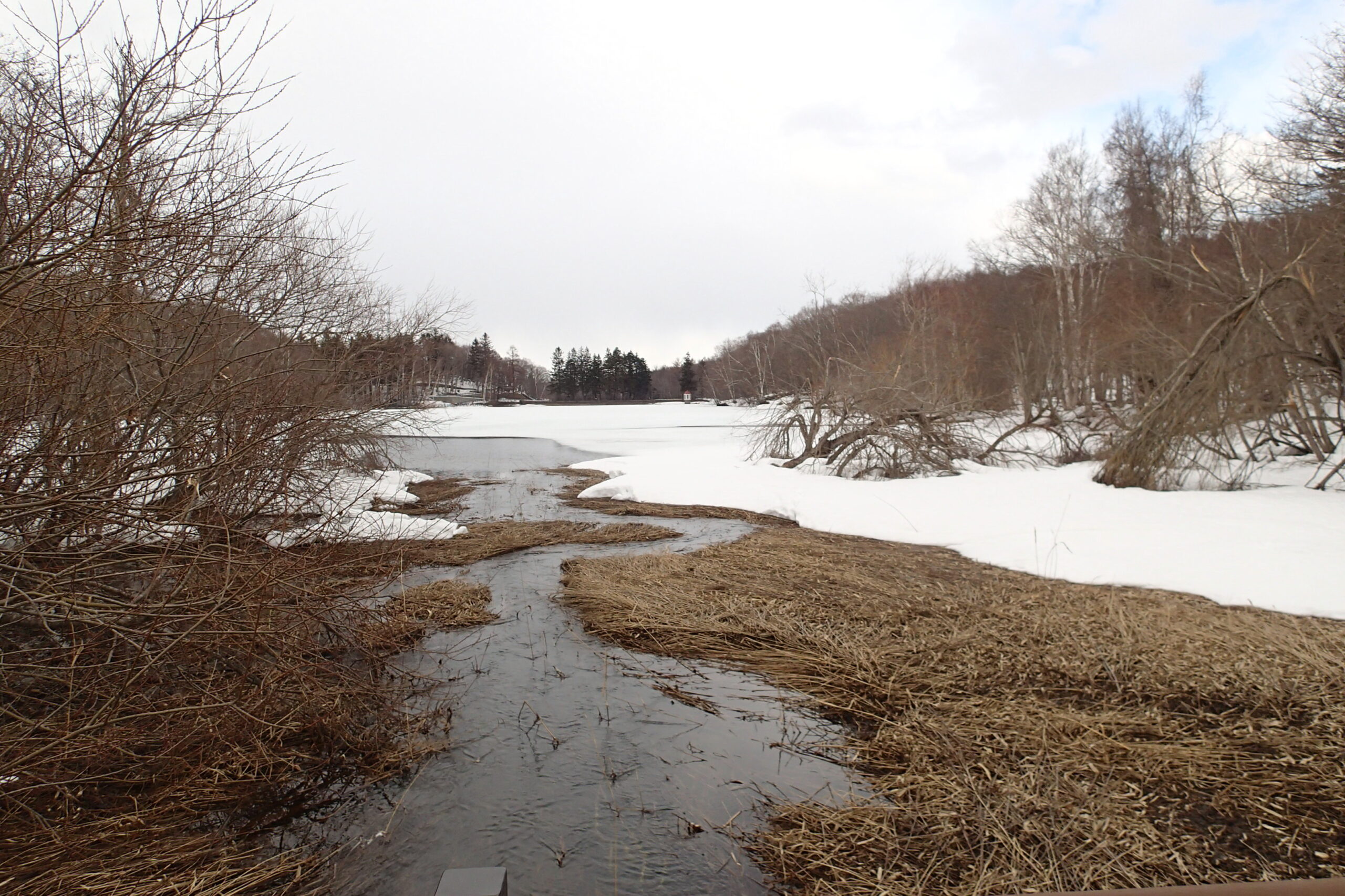 まだ凍っている池に川が流れ込んでいます。