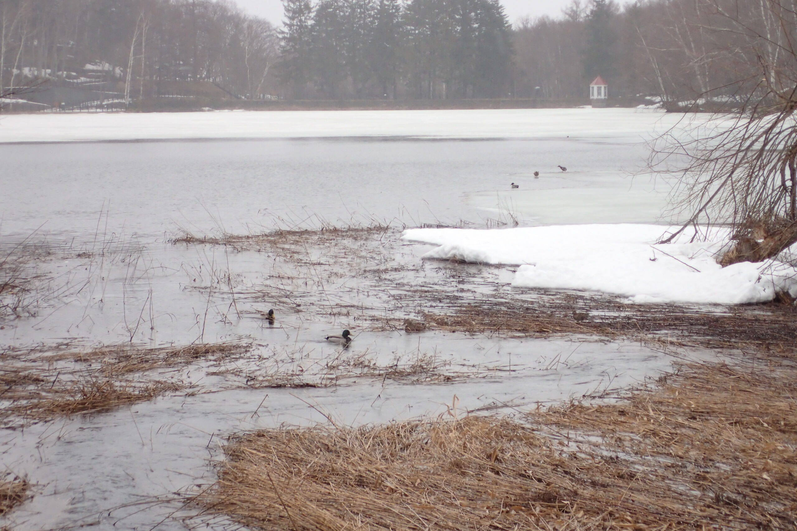 池はまだ大部分が凍っていますが、湿原から川が流れ込むあたりが少しずつ融けてきてカイツブリやマガモが泳いでいましたよ。