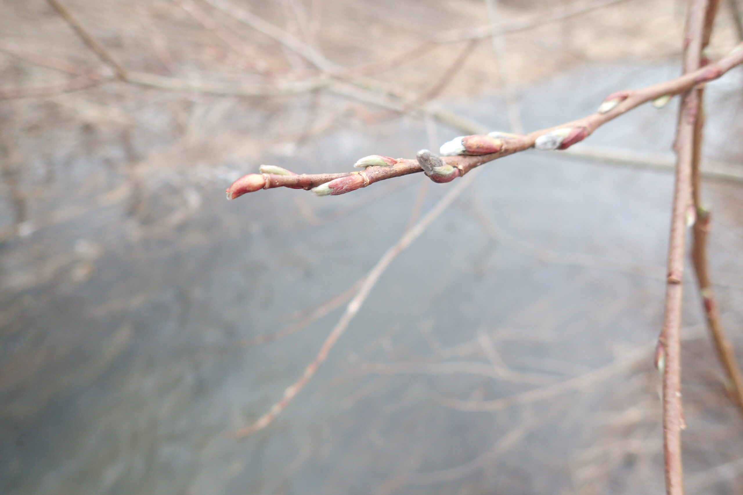 ヤナギの絹毛に包まれた冬芽が白く光って見えます。