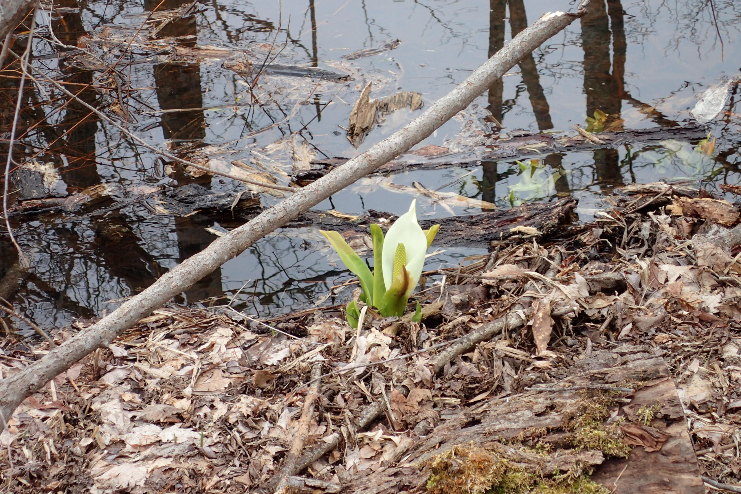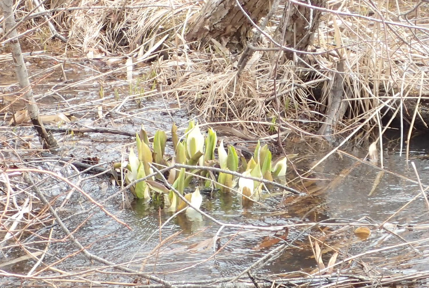 ミズバショウ仏炎苞が湿原の水辺に顔を出しています。