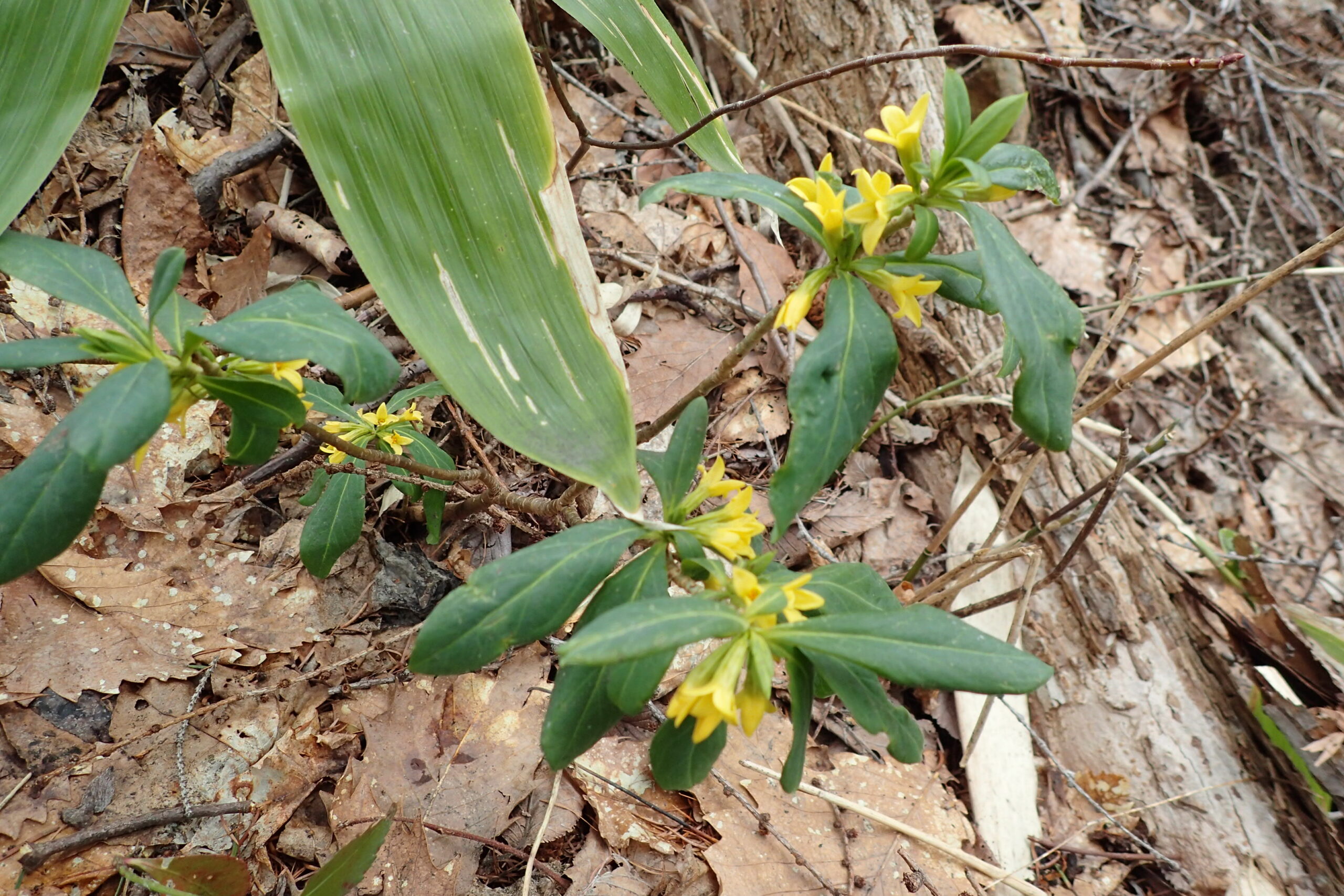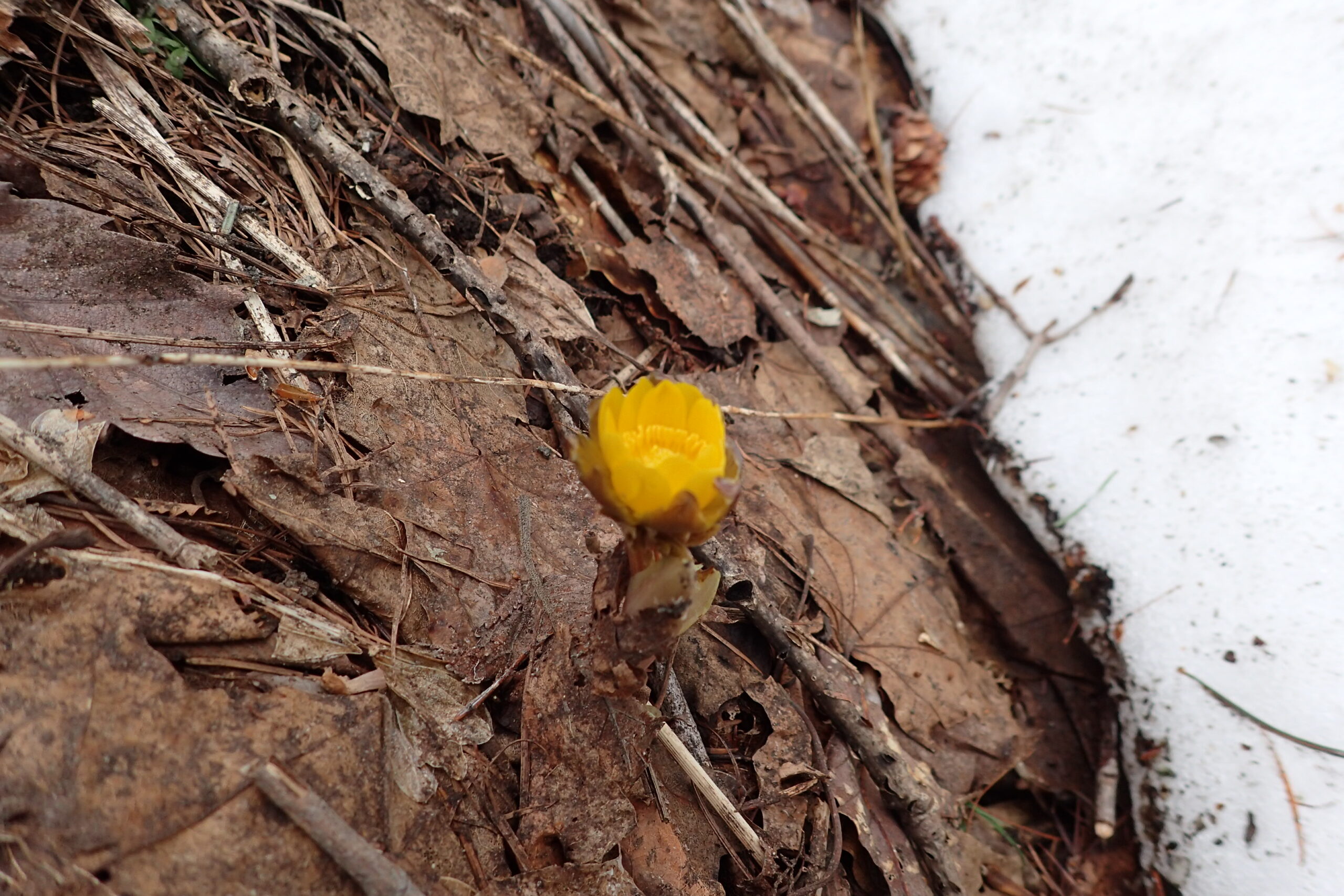 フクジュソウの黄色い花も咲いています。曇り空のせいか開ききっていませんね。