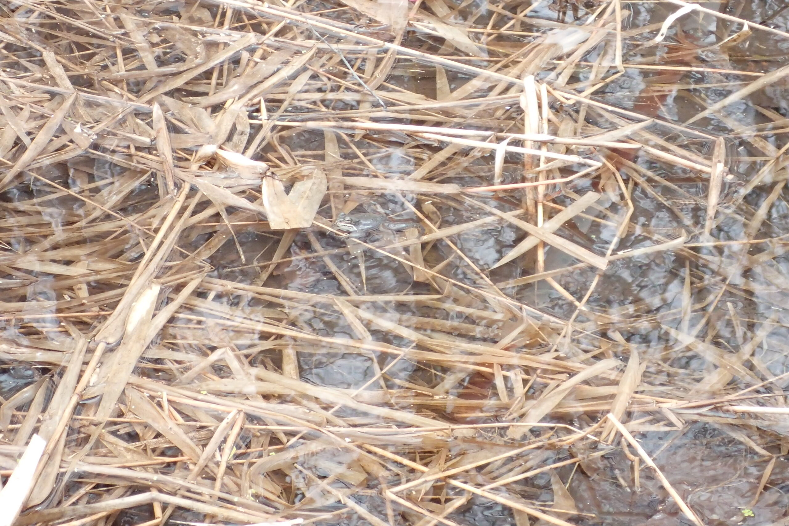 森林と水辺のあるところに生息する、エゾアカガエルです。人の気配に驚いて水の中に逃げてしまいました。水の中から顔を出して警戒中です。