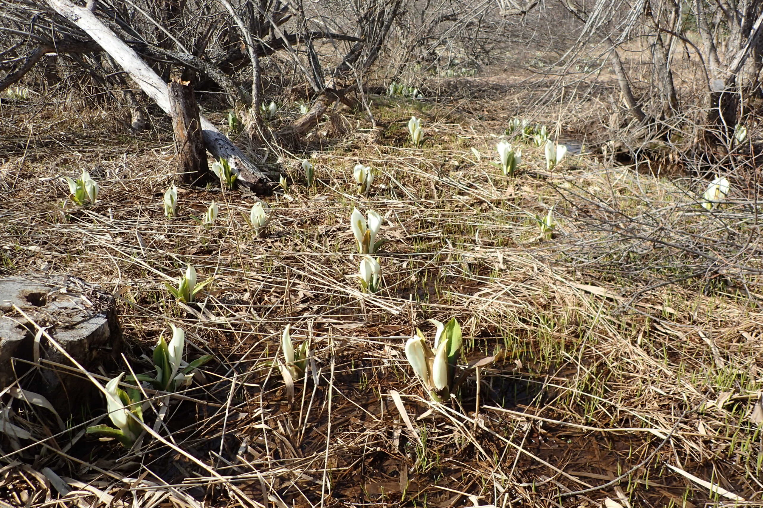 木道からは春の湿原に白い仏炎苞を広げ始めたミズバショウが見ごろを迎えています。
