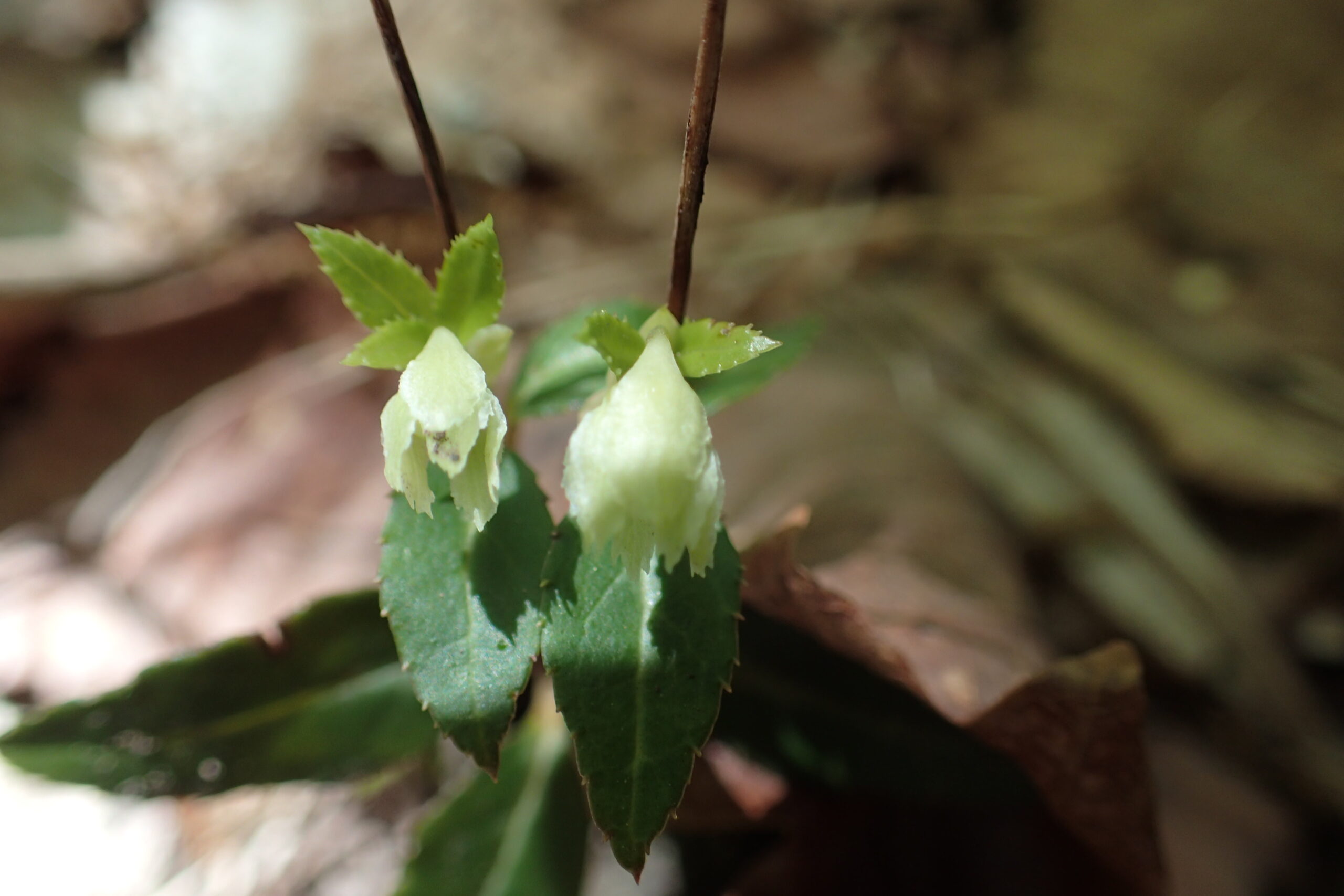 森の中の園路沿いには、ウメガサソウの小さい花が咲き始めました。5センチほどの小さい姿ですが常緑の小低木です。去年の果実がまだついていましたよ。