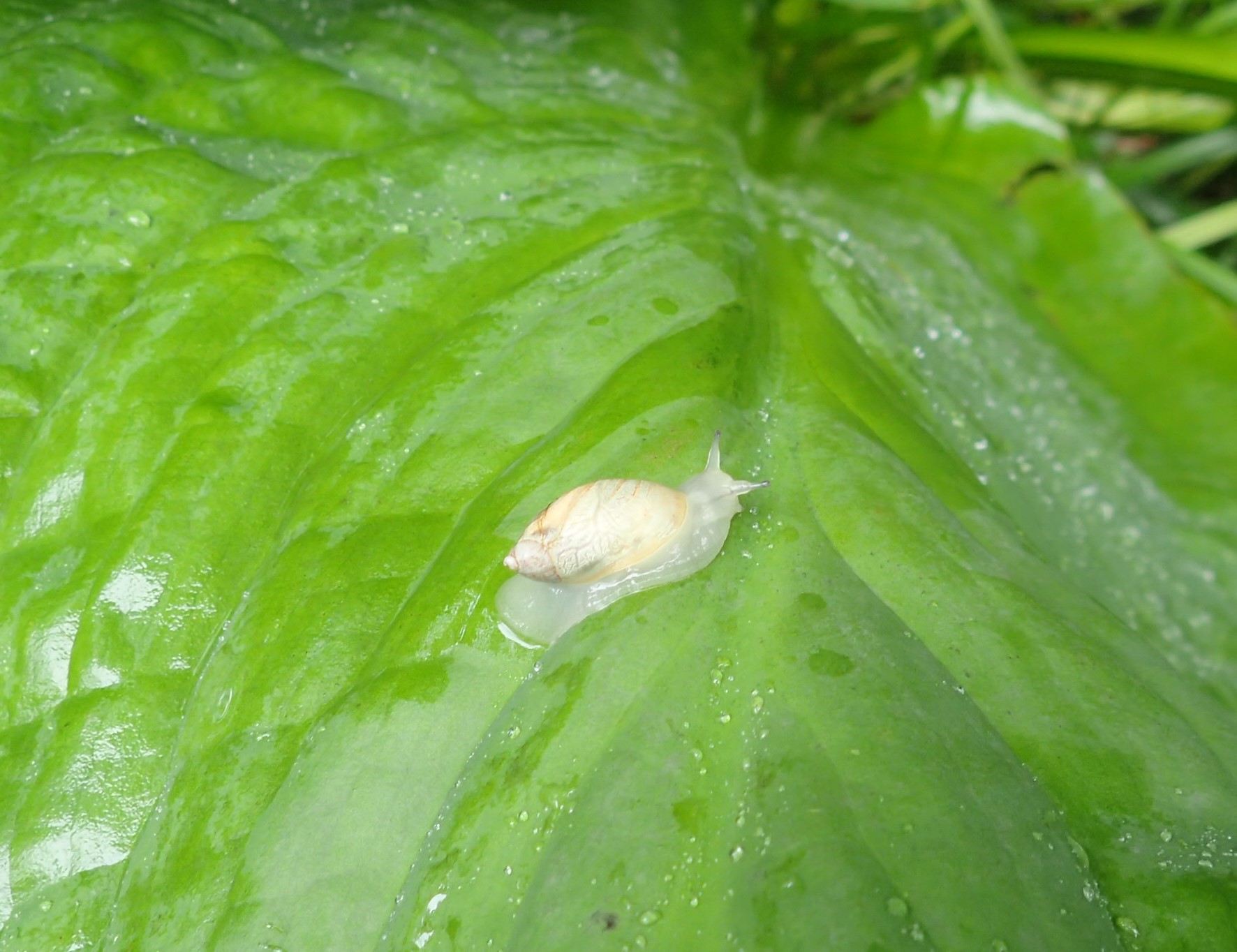 ミズバショウの葉の上にはオカモノアラガイがいましたよ。