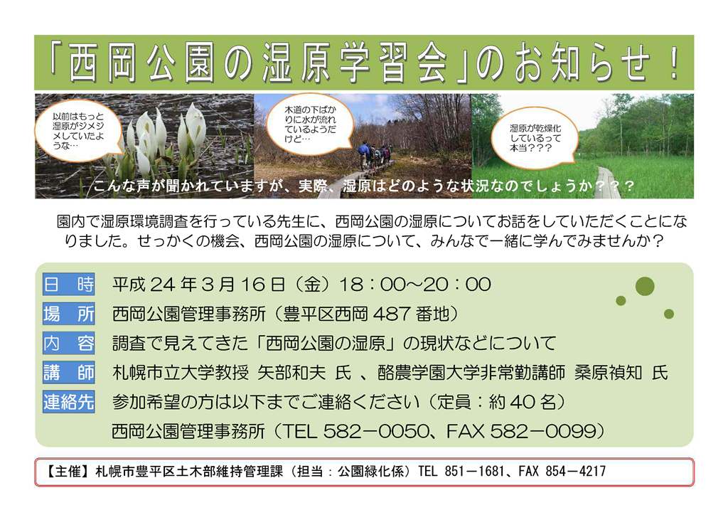 西岡公園は、水源池の上流に広がる湿原が魅力の一つです。 3月16日に土木センターの主催で、湿原の学習会を行うことになりました。 西岡公園の湿原調査のお話が聞ける、とても貴重な機会です。 参加ご希望の方は、西岡公園管理事務所までお申込みください。 皆様のご参加、お待ちしています♪