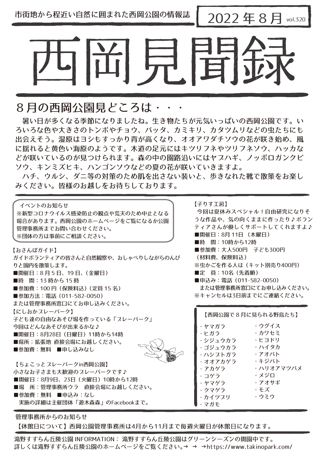 そんな西岡公園では「西岡見聞録」8月号が出来ましたよ。ご覧になりながら園内の散策をお楽しみください。