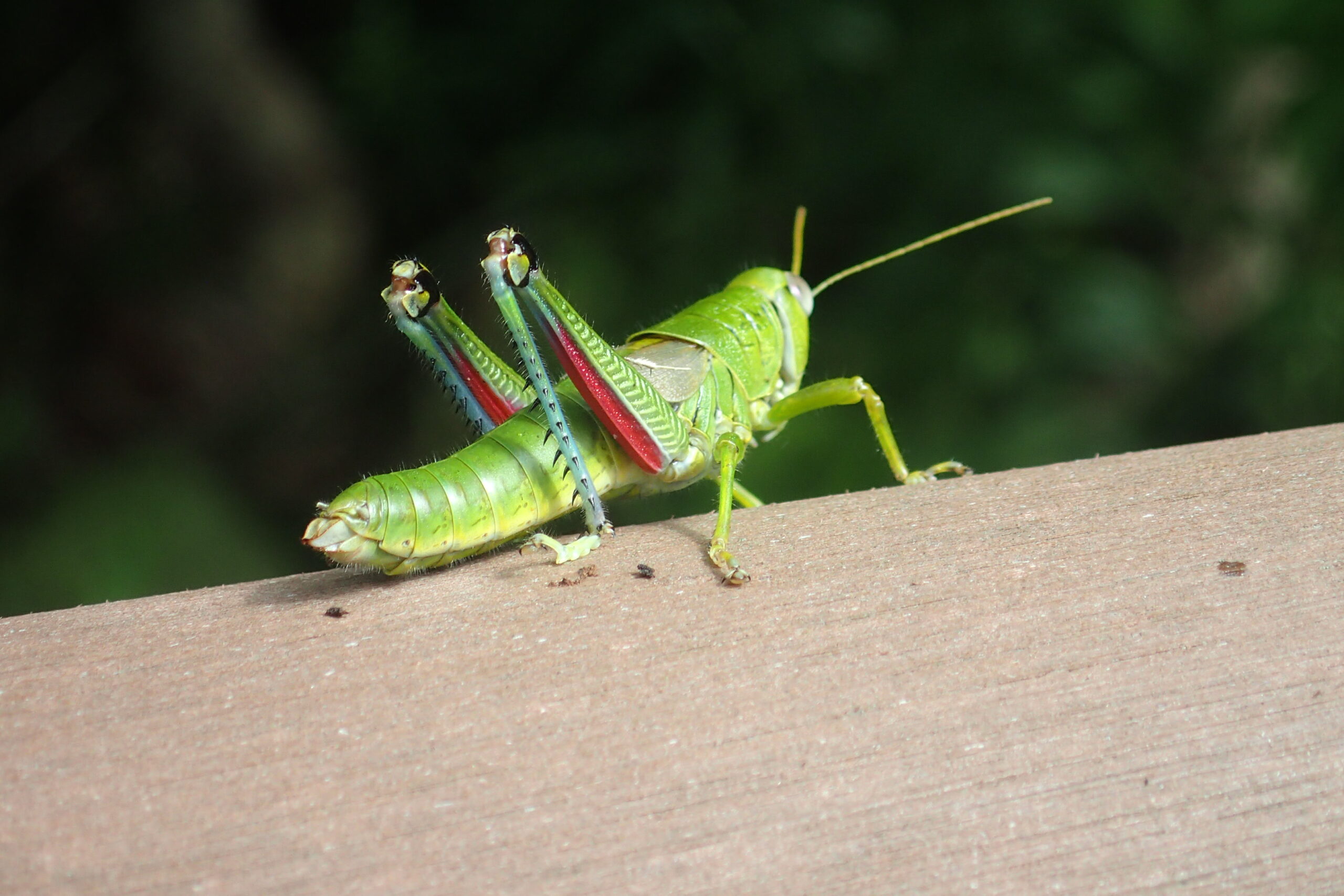 ミカドフキバッタが木道の柵にいましたよ。足の赤色がかっこいいですね。