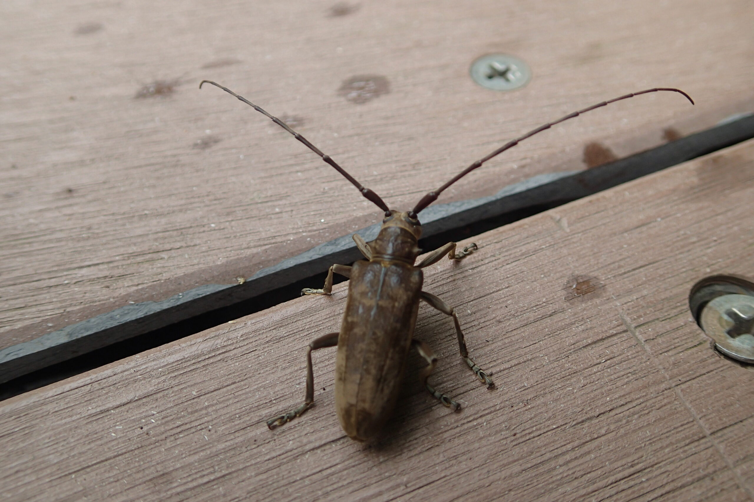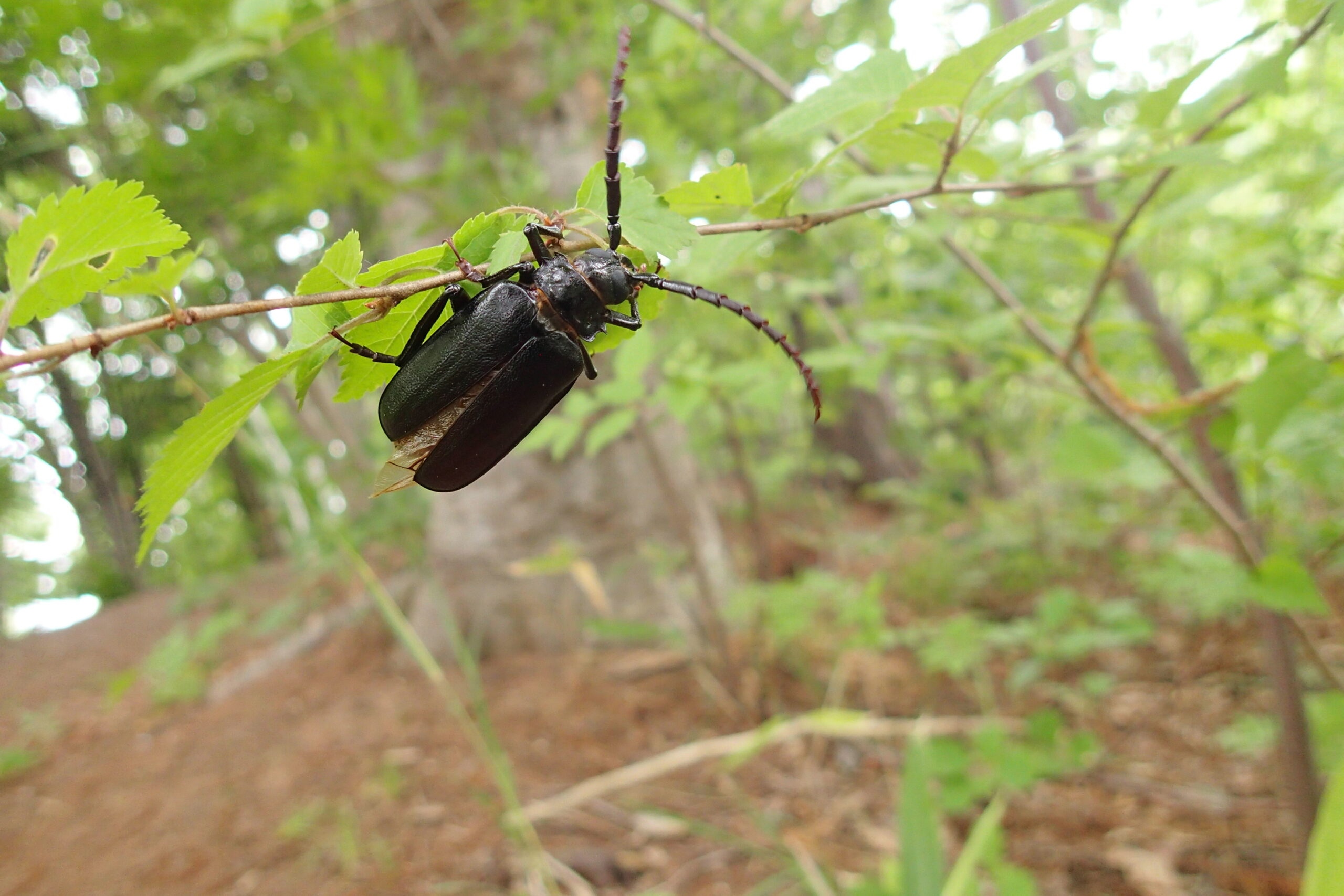 森の中ではノコギリカミキリをたくさん見かけましたよ。驚くと、「ギッギッ」と大きな音を出しますよ。