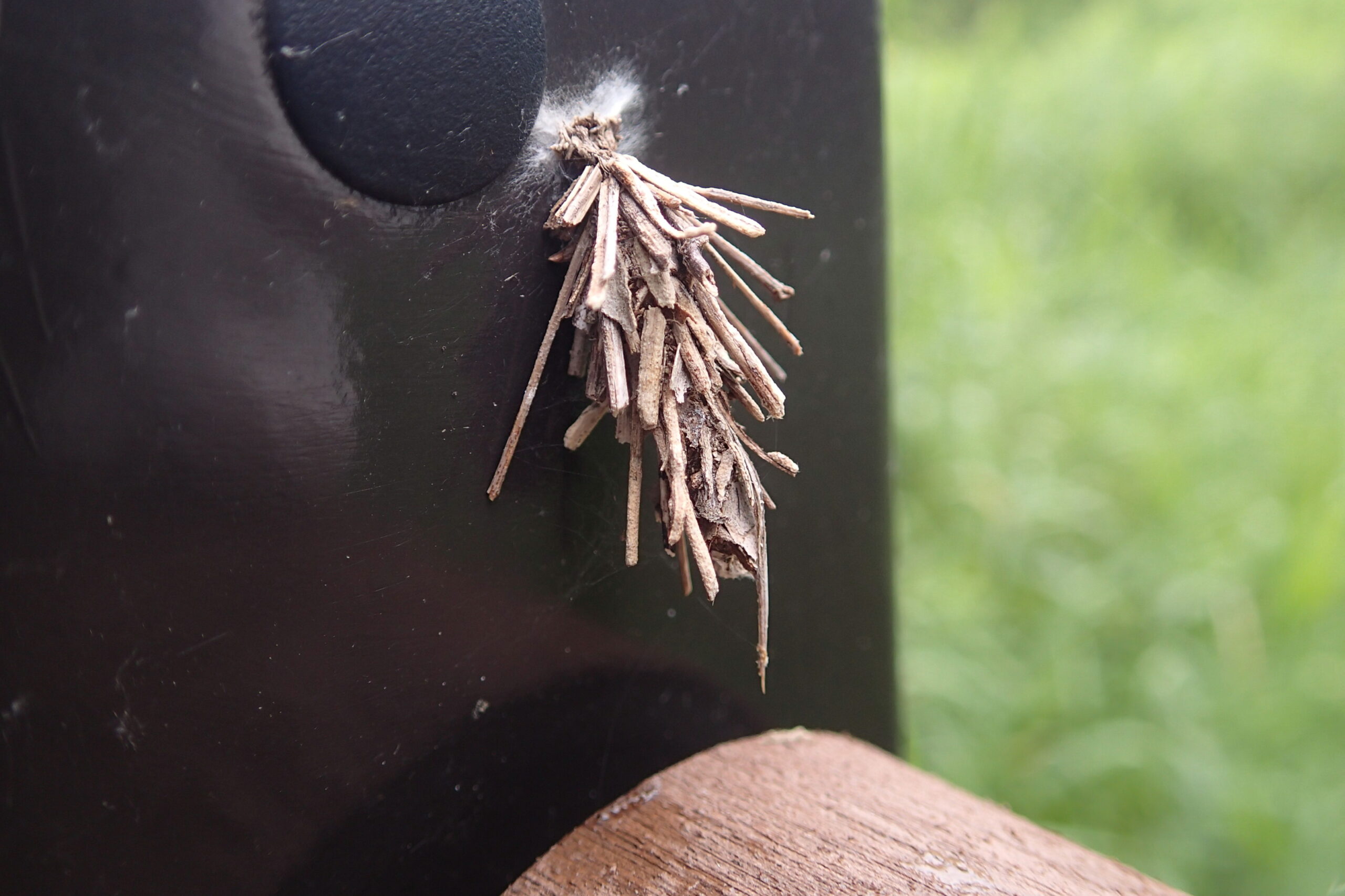 ミノムシは枯れ葉や小枝で作った巣の中で過ごしています。この巣の中でさなぎになってガになりますが、成虫がガの形になるのはオスのミノムシだけで、メスの成虫は羽がなく、一生を巣の中で過ごすそうです。