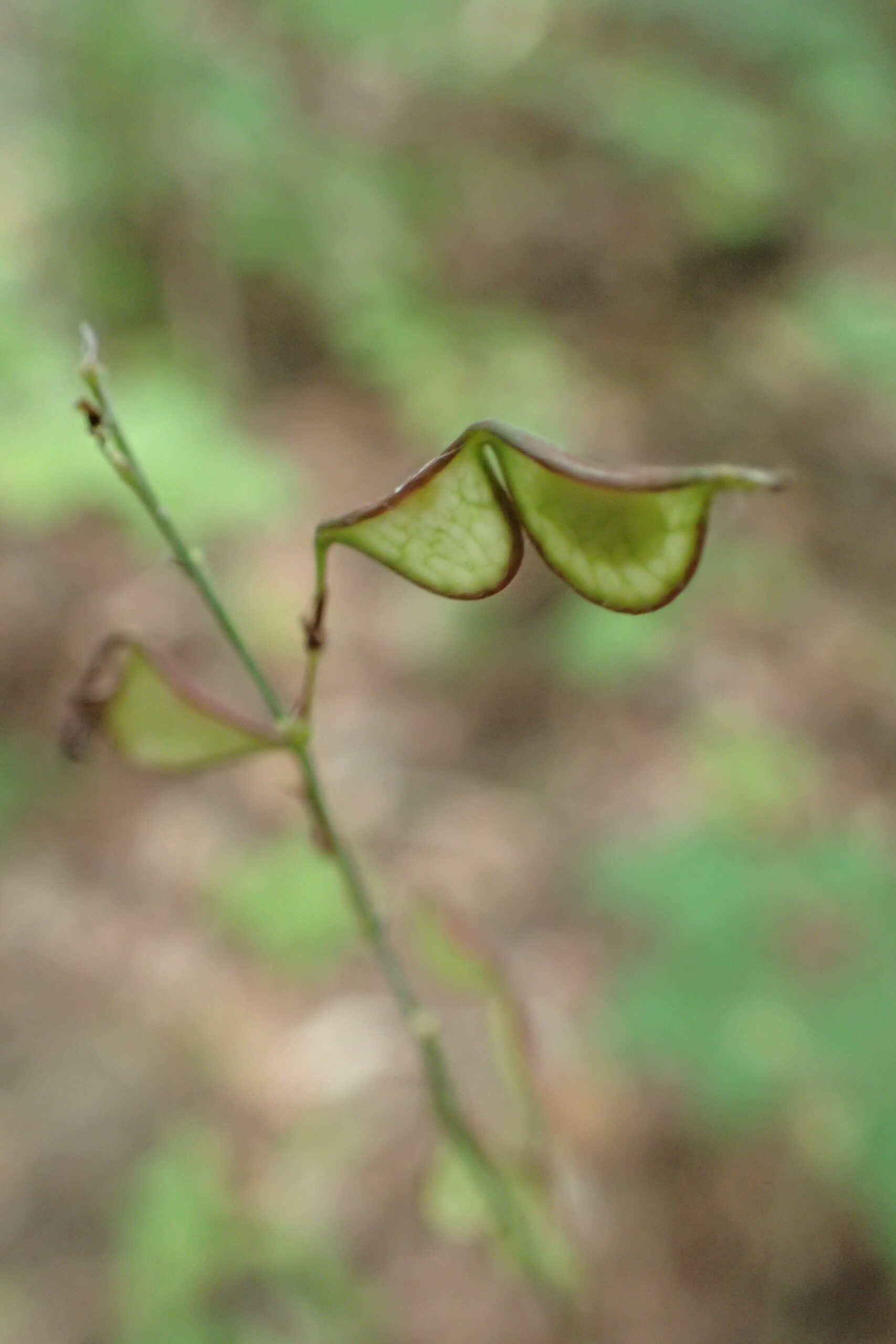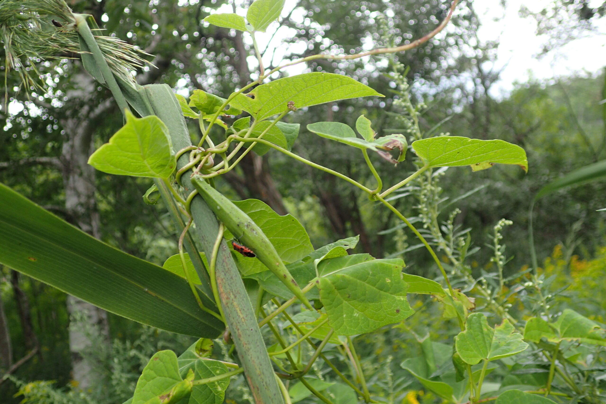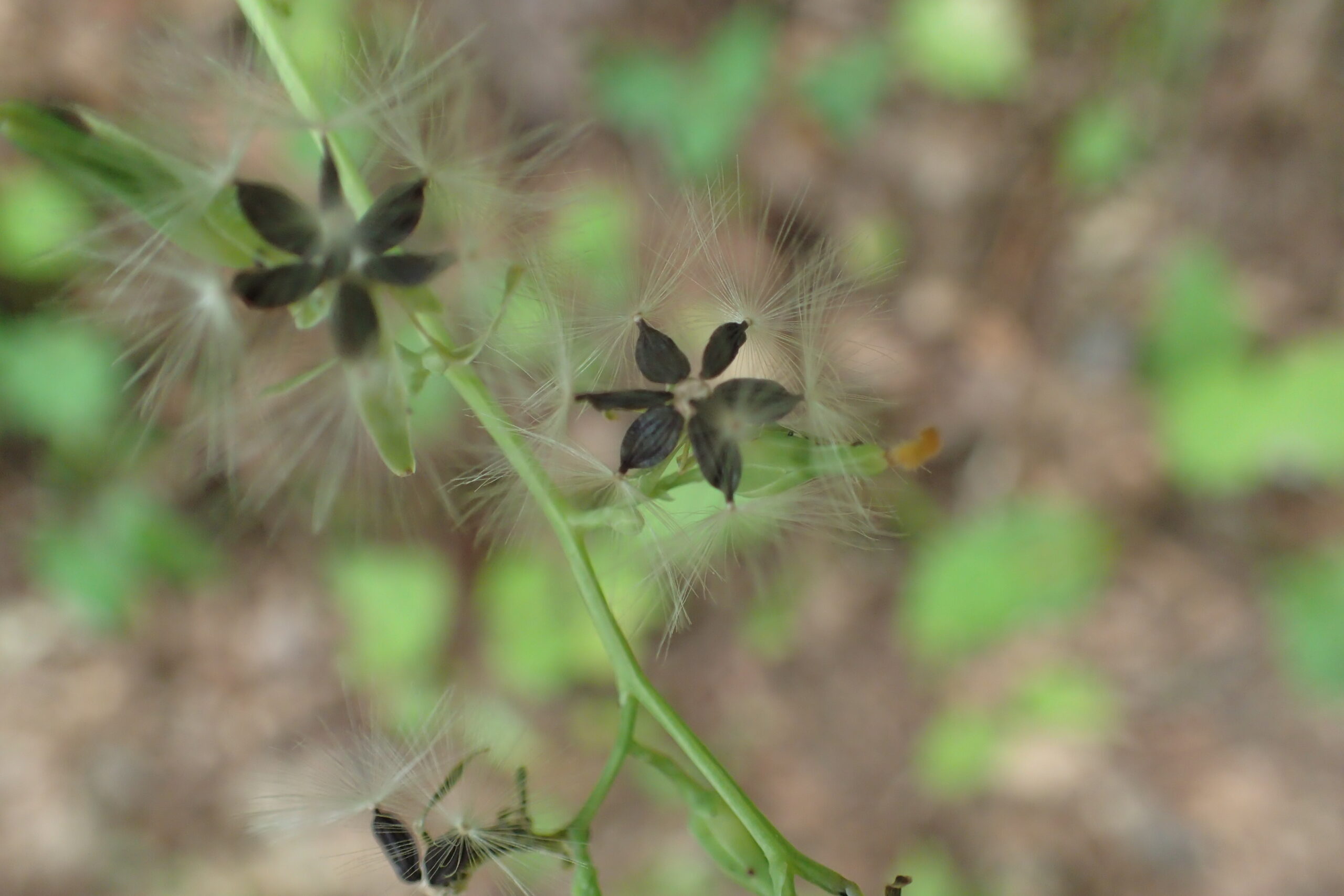 これはイケマの果実です。熟すと中から出てくる種子には長い種髪がついていて、風に運ばれます。