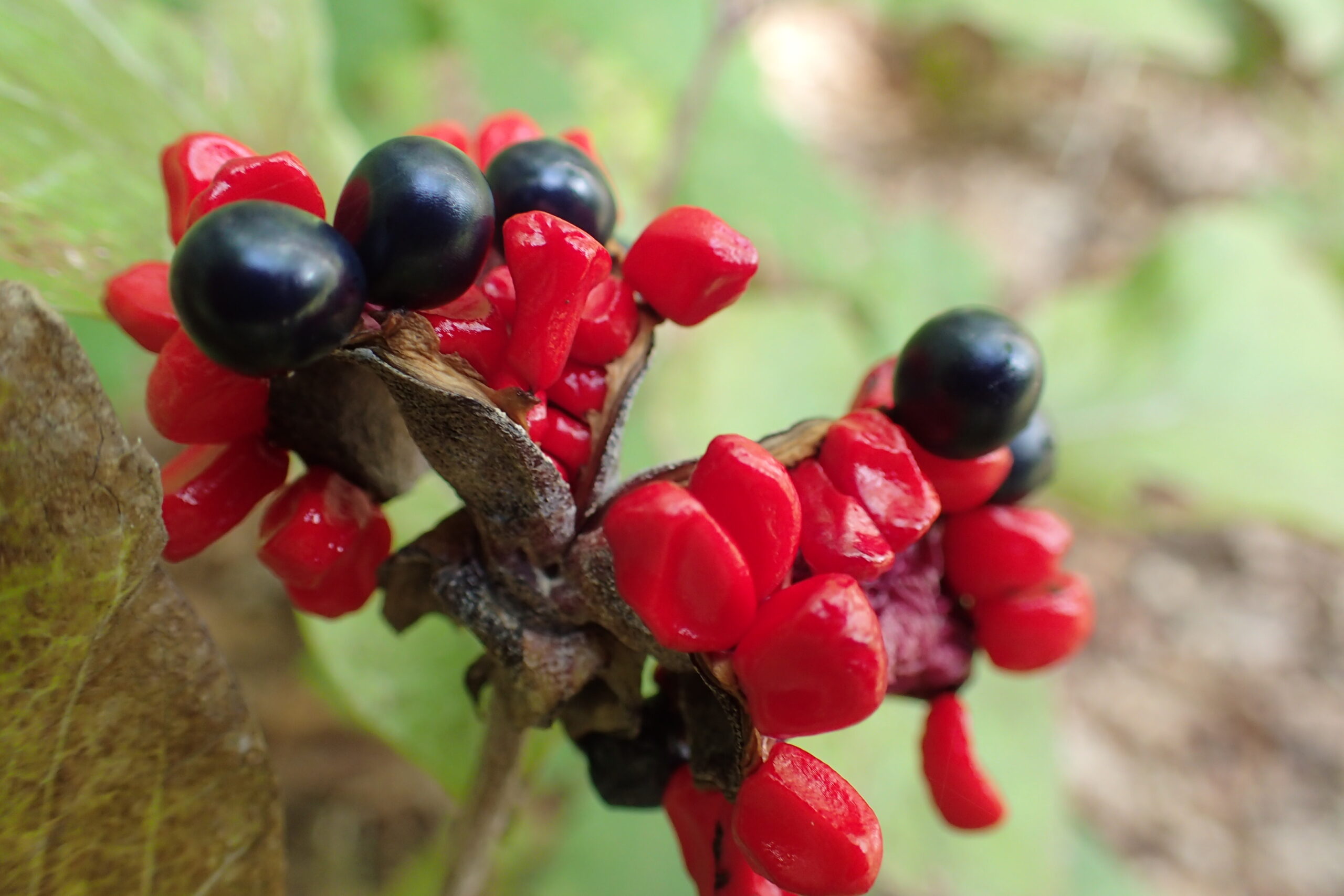 ヤマシャクヤクの鮮やかな赤の偽物の種子と黒の本物の種子。鳥などの生きものに運んでもらうのでしょう。