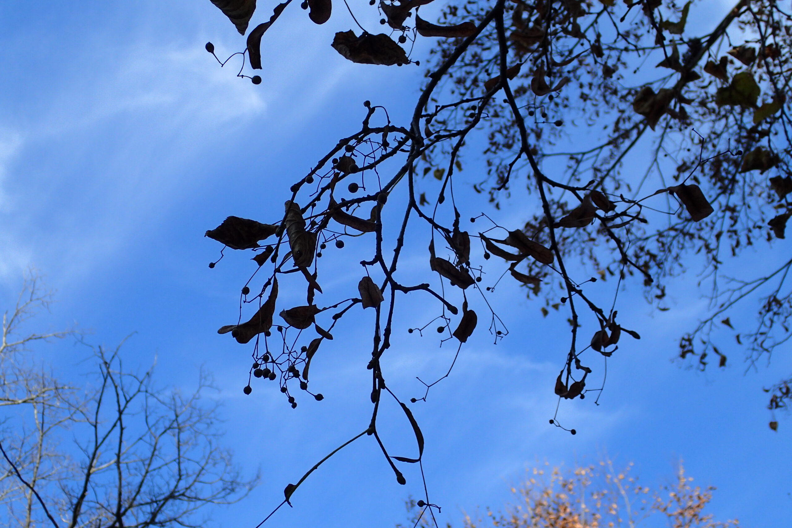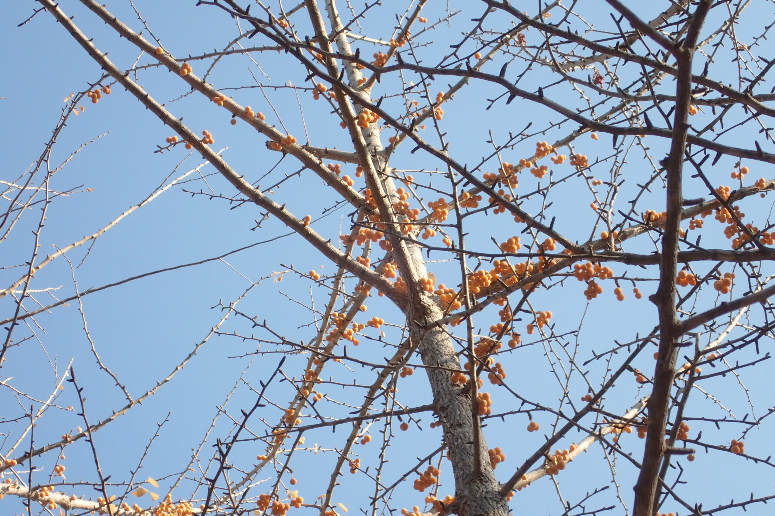 すっかり葉を落としたイチョウには枝についている果実(銀杏)が見えます。