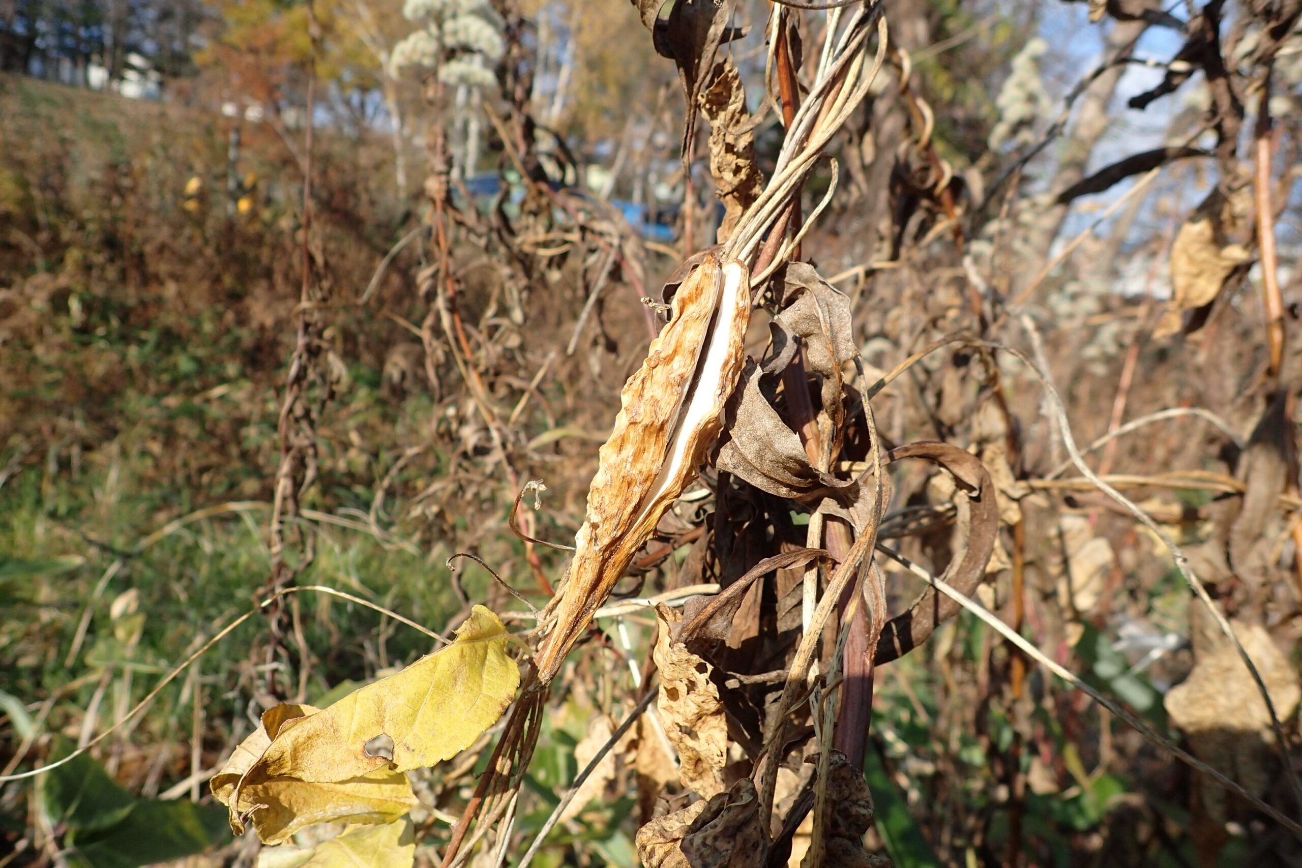 ガガイモの果実が開きかけていましたよ。開くと綿毛のついた種子が風に乗って飛んでいきます。