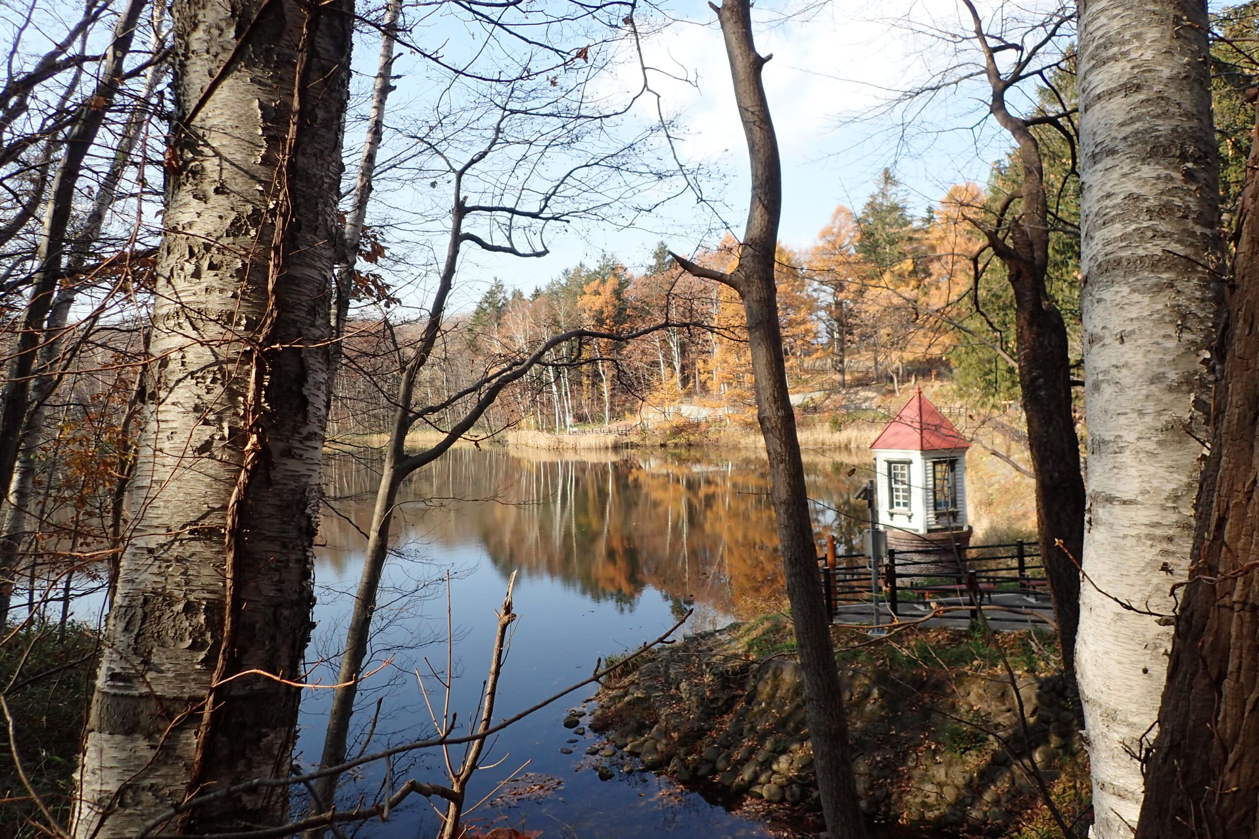 カラマツの黄色い紅葉が鮮やかになると、池にカラマツの紅葉が映って、水鏡の見られる晴れた日にはとてもきれいですよ。