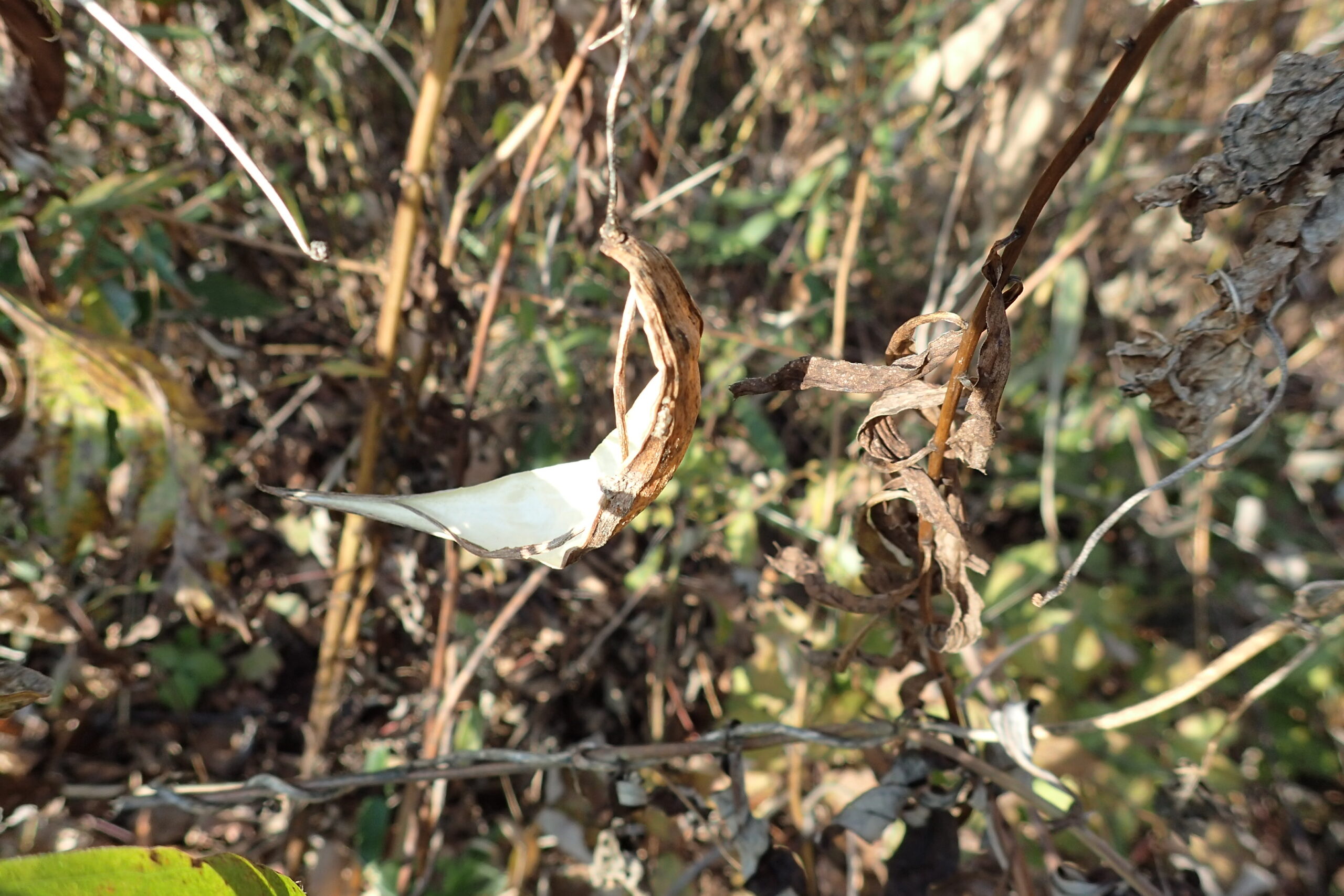 ガガイモの仲間のイケマは夏の終わりに種子が出ていきました。種子が飛んで行った後の果実は船のような形です。昔の子どもが川に流して遊んだというのを本で読んだことがあります。