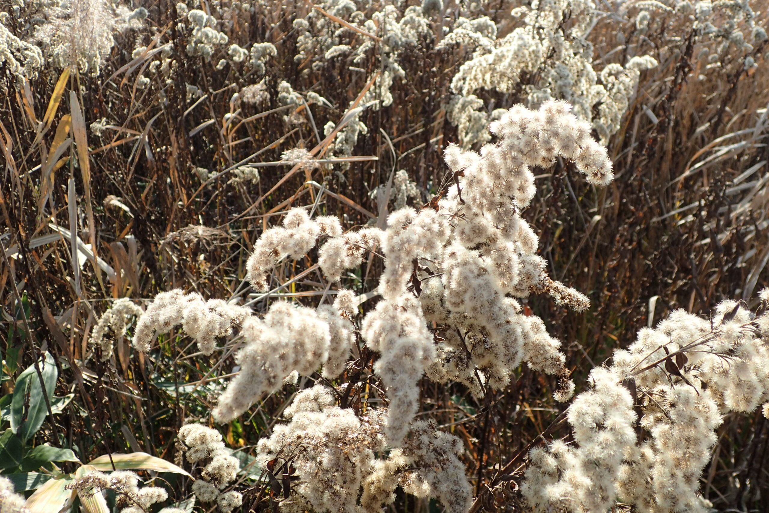 オオアワダチソウの冠毛もフワフワしてきました。これもまた風に乗って飛んで行くタイプの種子散布をする植物ですね。