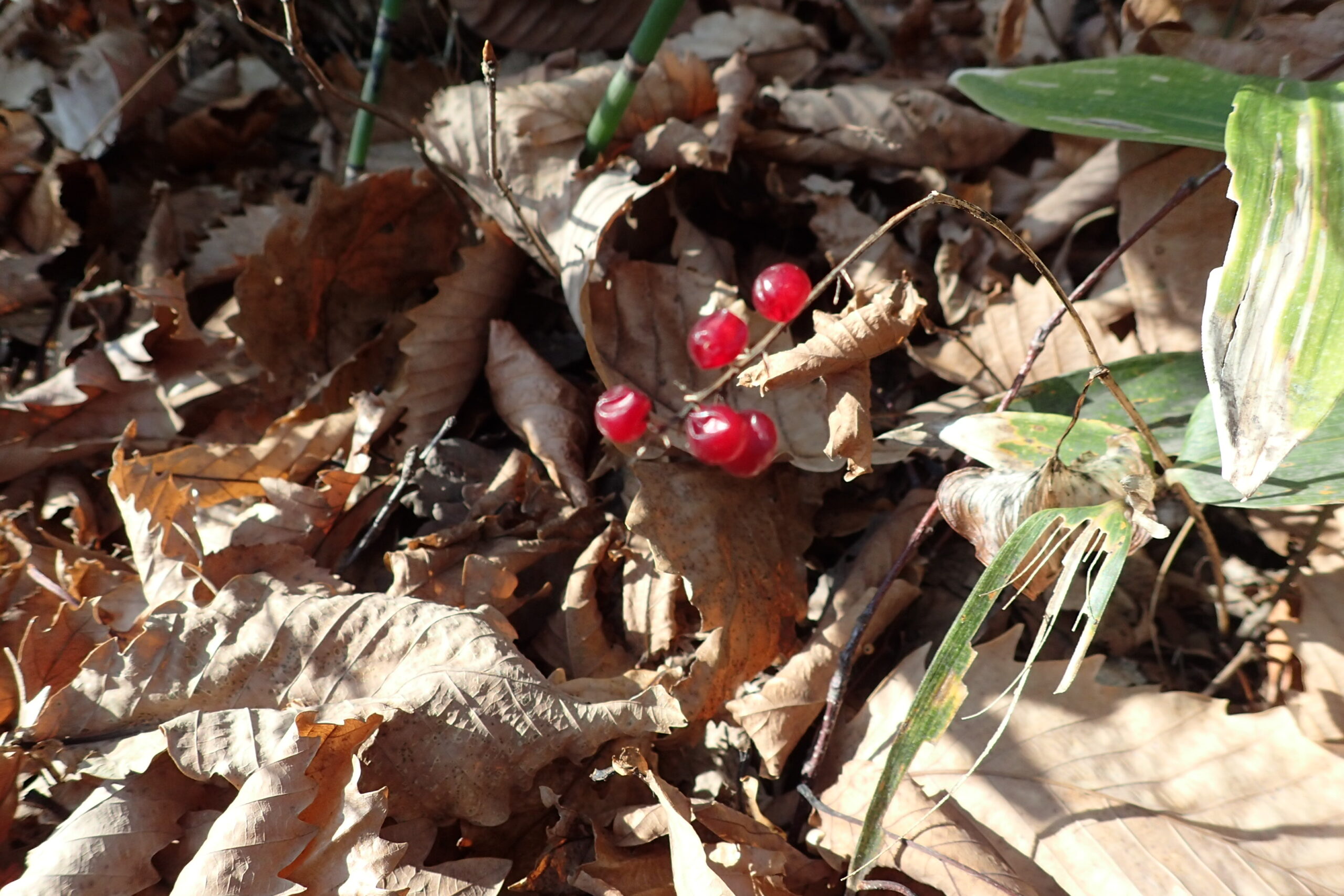 マイヅルソウの赤い果実は日が当たるとほんのり透き通って宝石みたいです。