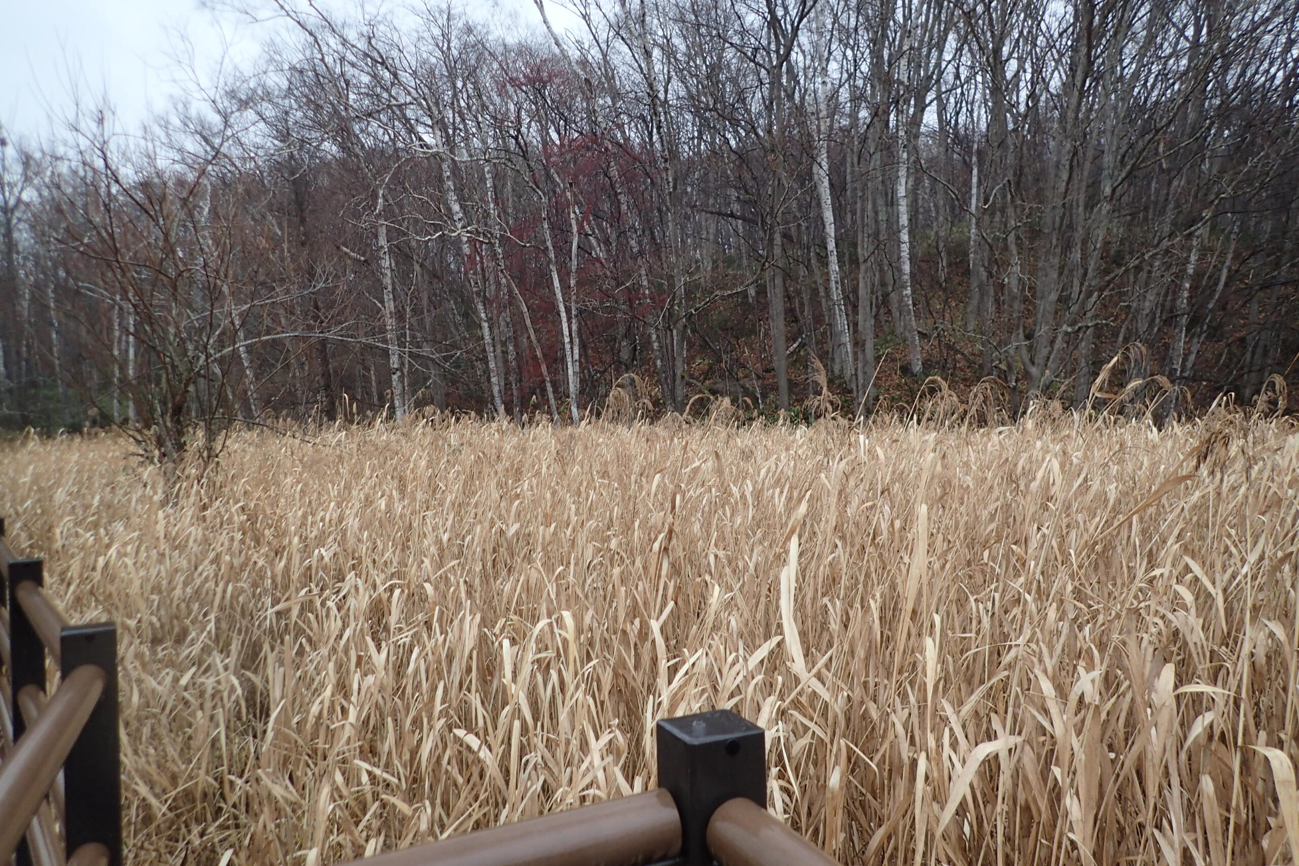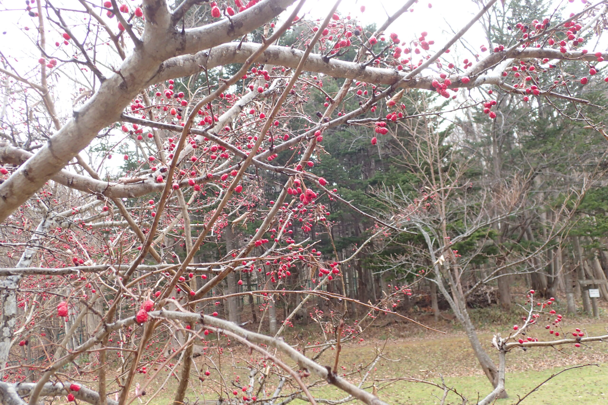 湿原も、奥の山もすっかり冬の色彩ですが、時々赤い実をたくさん付けた樹木を見かけます。