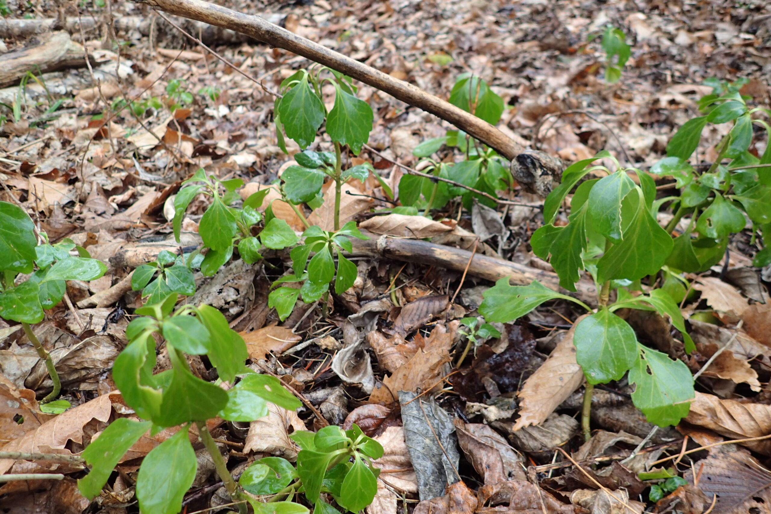フッキソウの葉が雨に当たっていっそう鮮やかです。