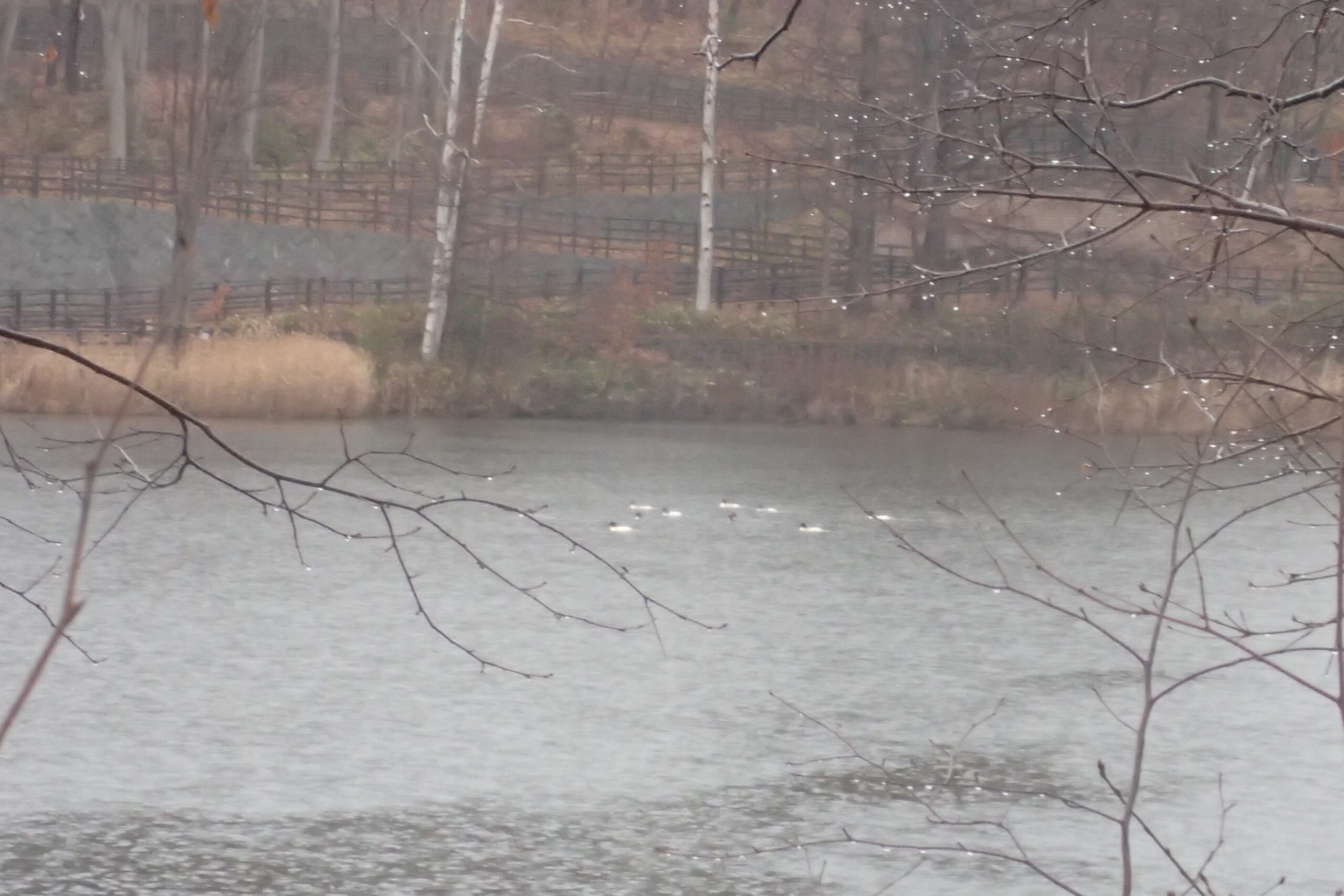 池ではカワアイサという大型のカモが群れで魚などの餌を採っています。