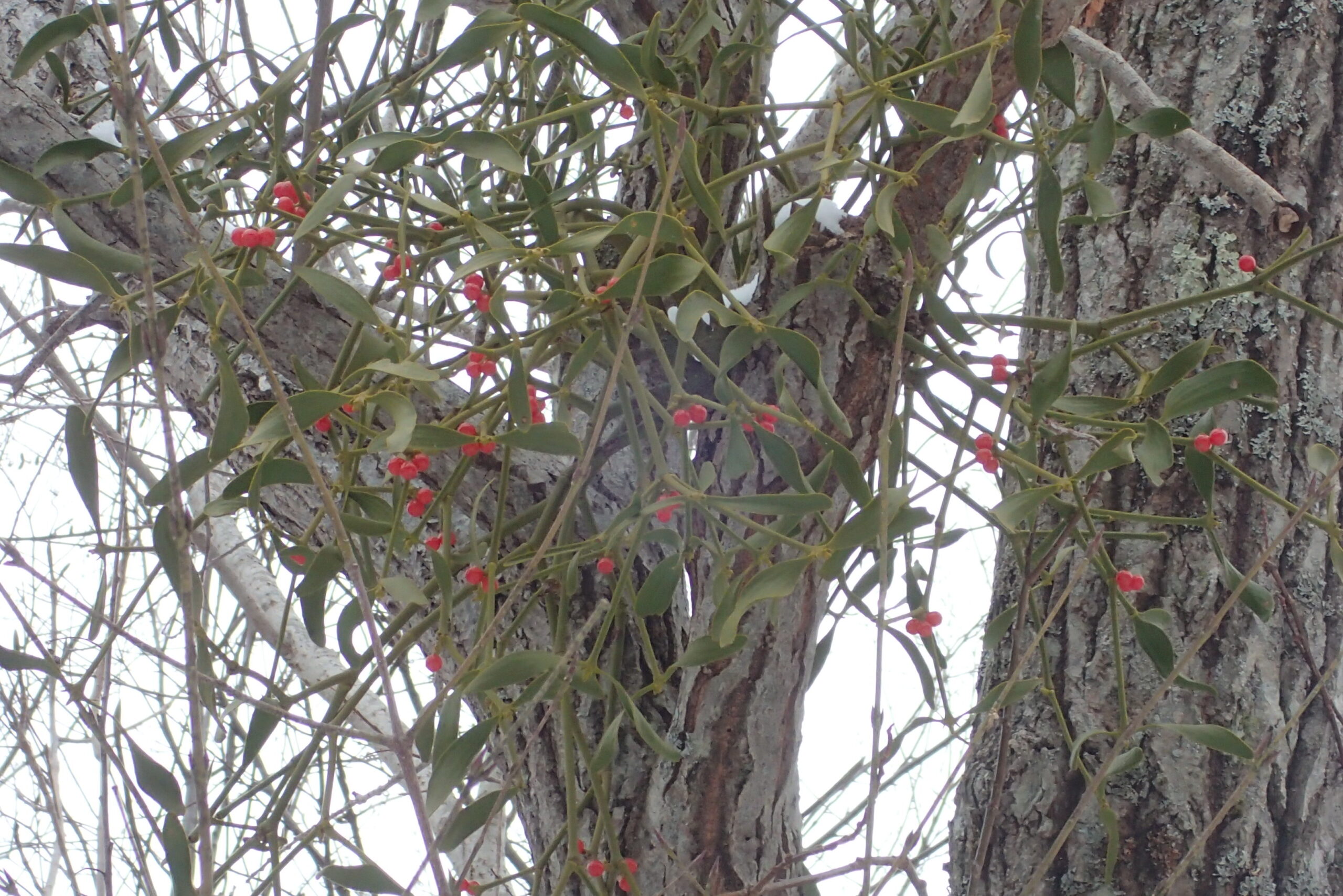 西岡公園で見られるヤドリギは赤い果実を付けるアカミノヤドリギばかりです。