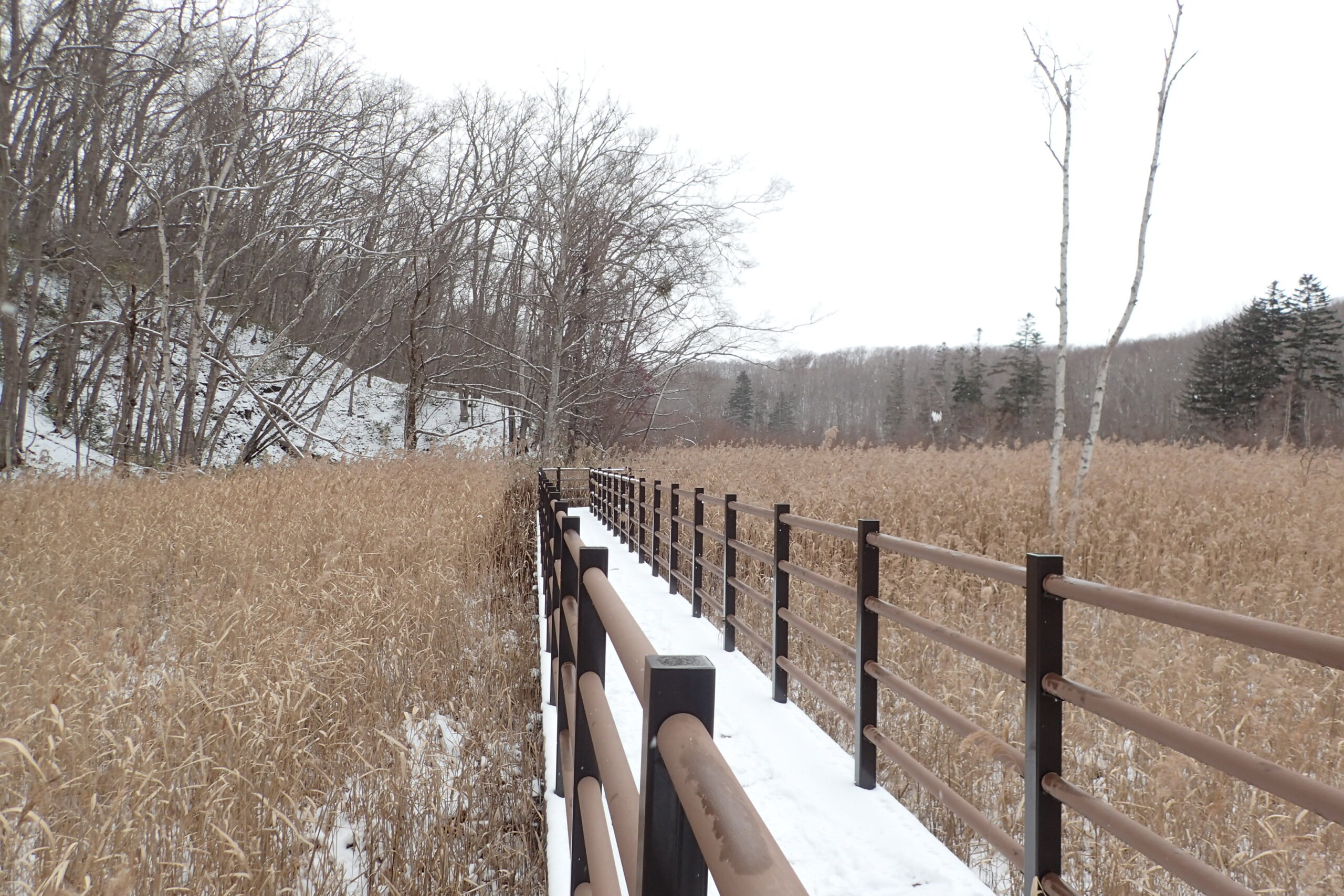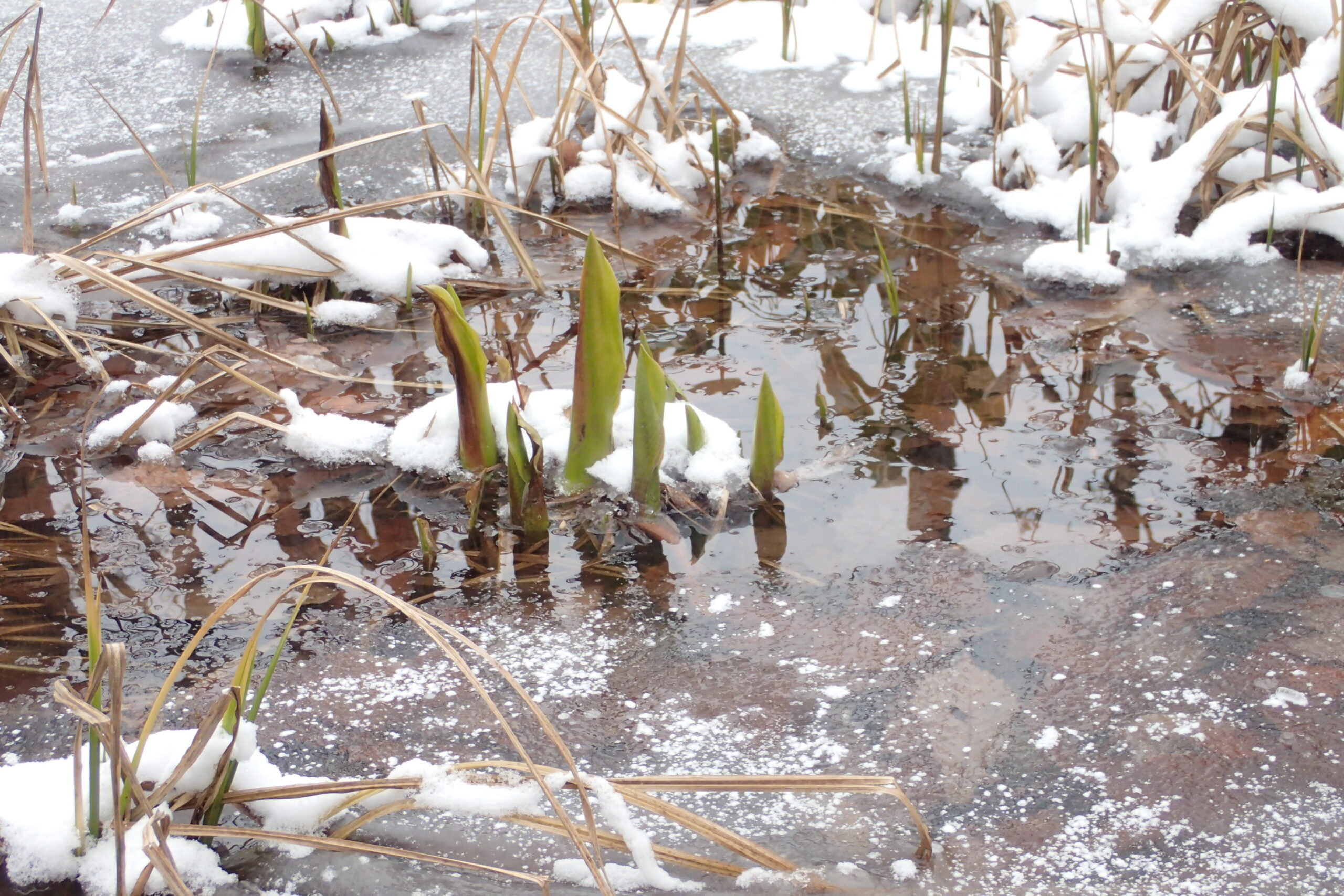 凍り始めた湿原にはミズバショウの芽が水面から突き出していましたよ。