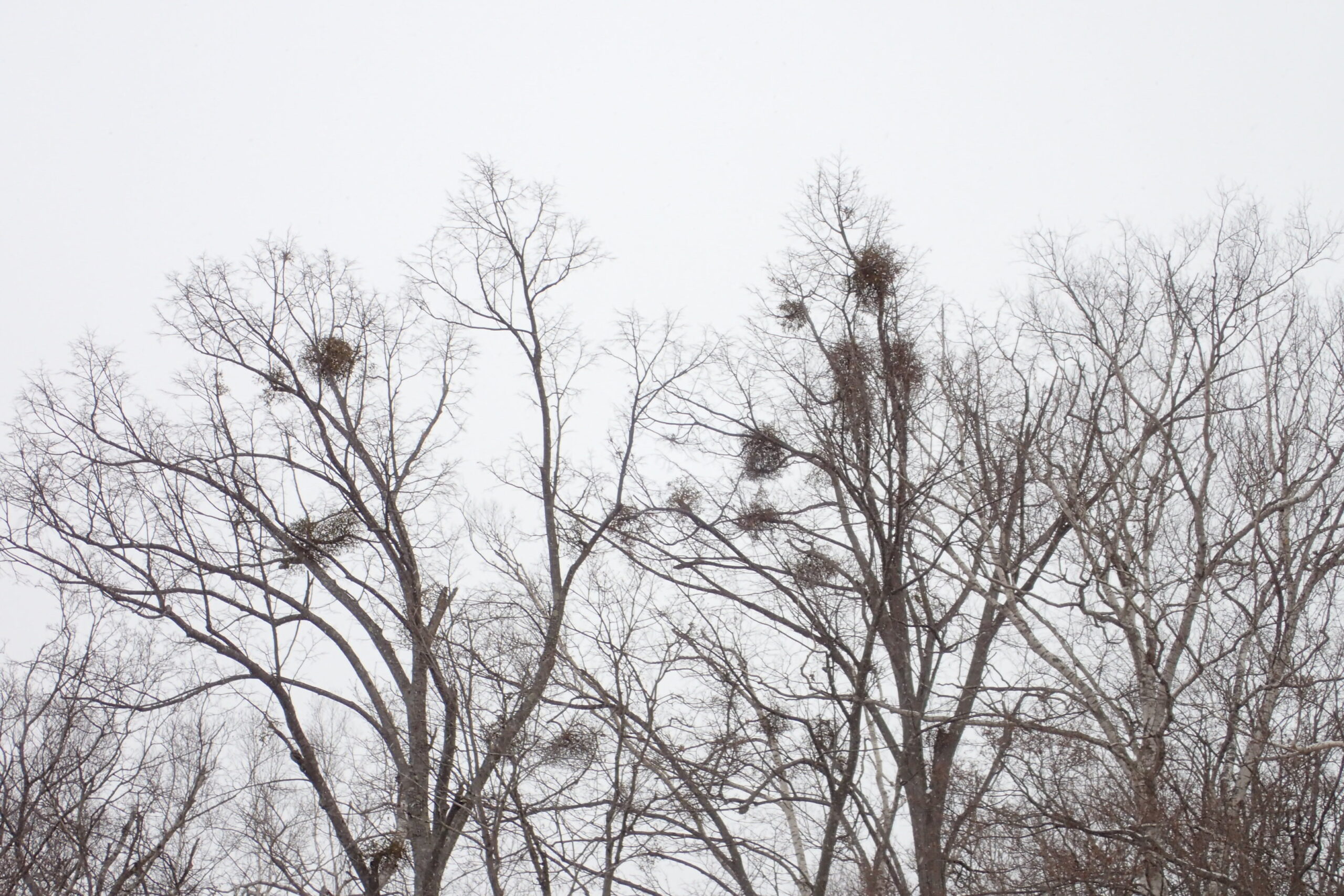 木の梢にはヤドリギがたくさんついています。鳥の巣のように見えますね。