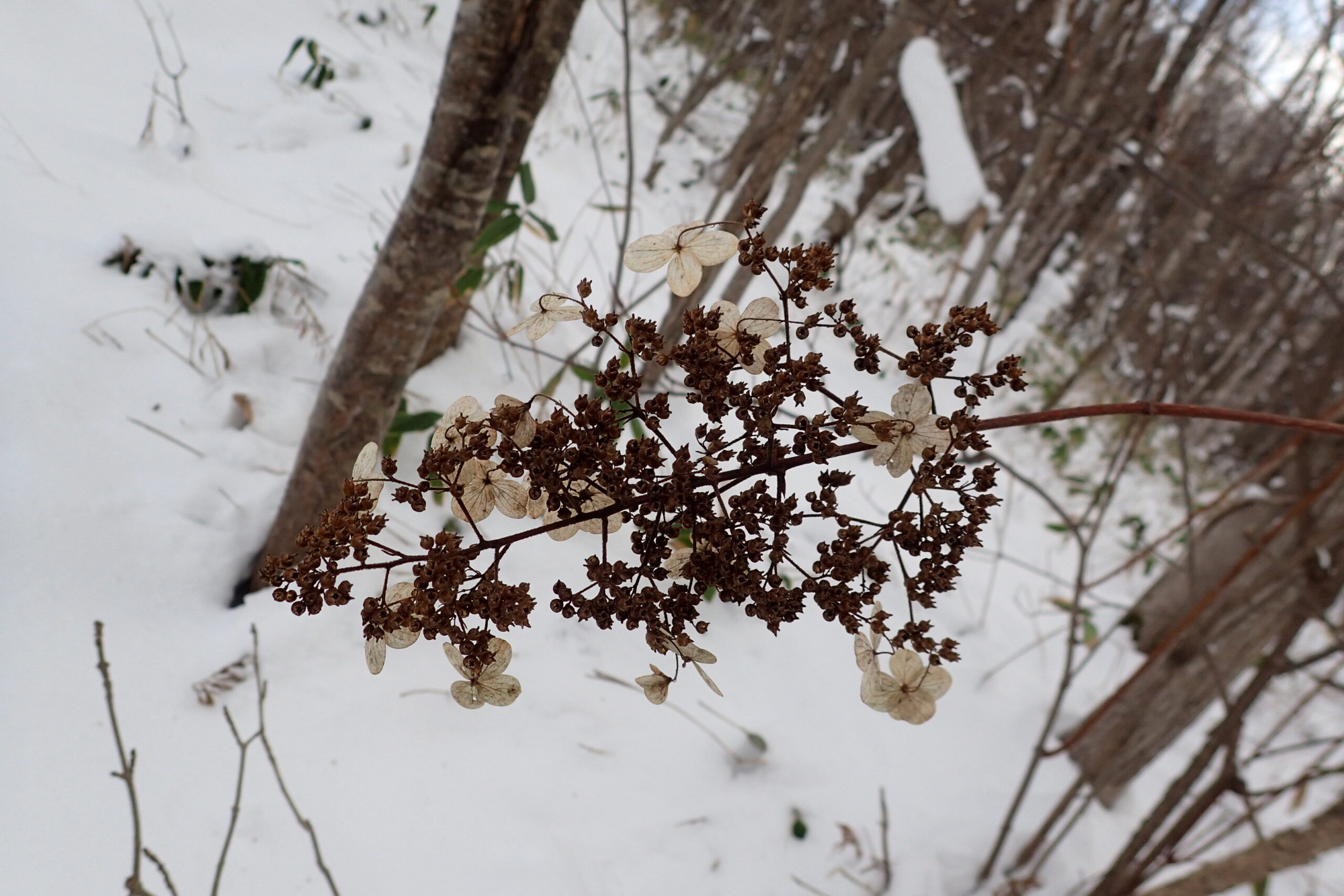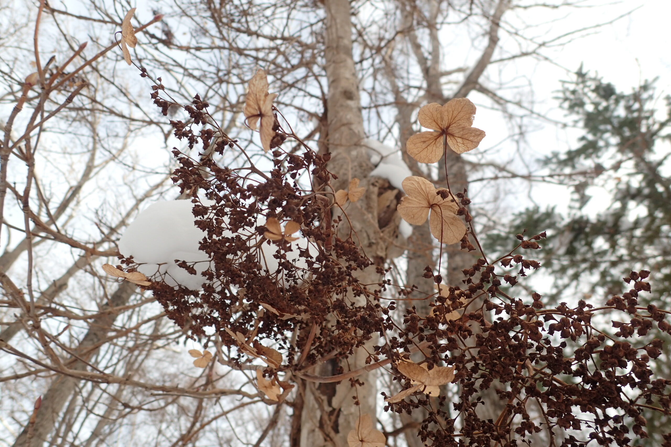 園内では、夏の間涼し気な花を咲かせていたノリウツギの飾り花が、ドライフラワーになってあちこちでみられますよ。円錐のシルエットが特徴ですよ。