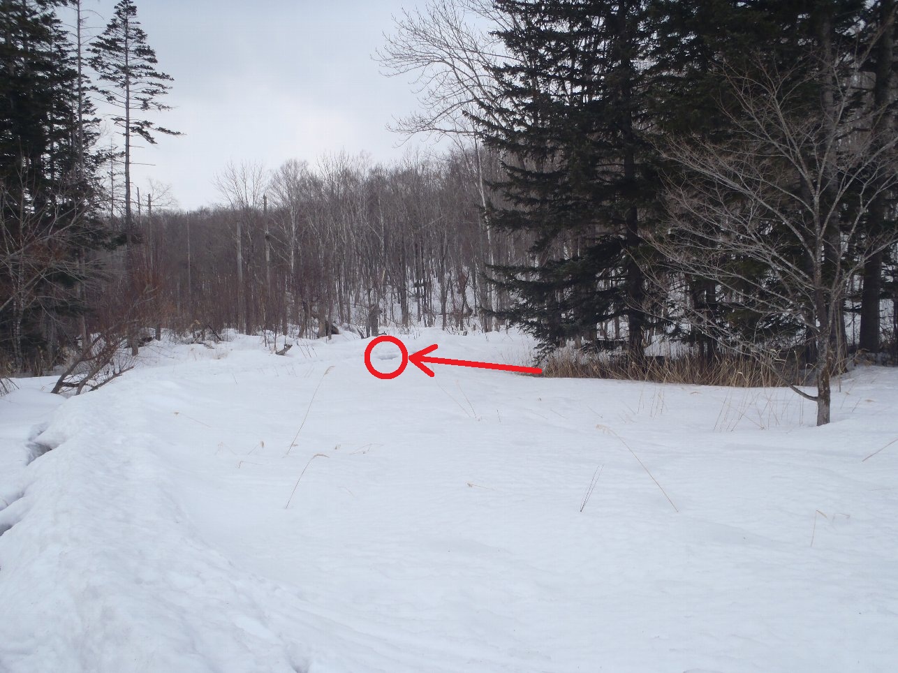 湿地の中央にある木道をバランスをとったり、落ちながら歩いていると、右のトドマツの下から、木道に向かって2つの黒いもじゃもじゃが移動していきました。素早く双眼鏡をのぞきこんで見ると、どうやらタヌキと思われる生き物が雪の穴から木道の下へと入って行きました。