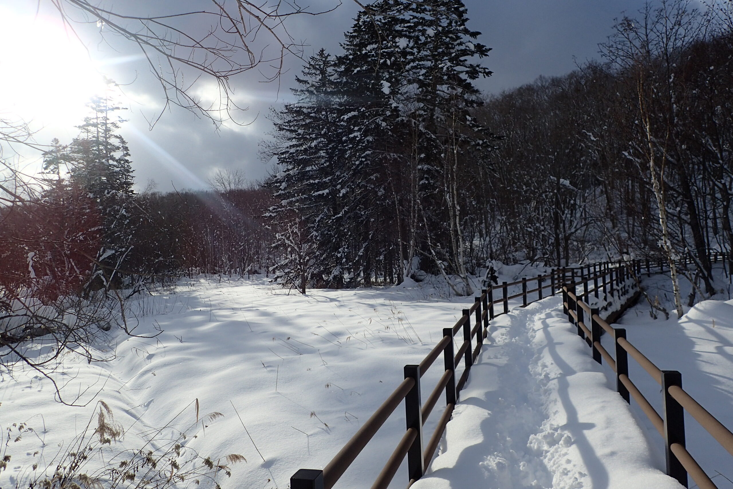 湿原の木道の雪も深くなってきましたよ。ヨシはほとんど雪の下に埋もれてしまいました。