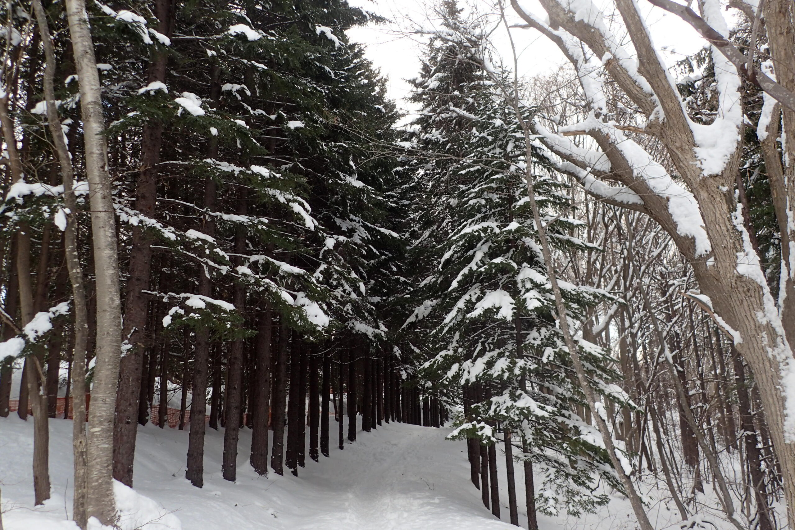 今日の西岡公園は昨日降った雪で、園路にも樹の上にもたくさんの雪が積もっていますよ。
