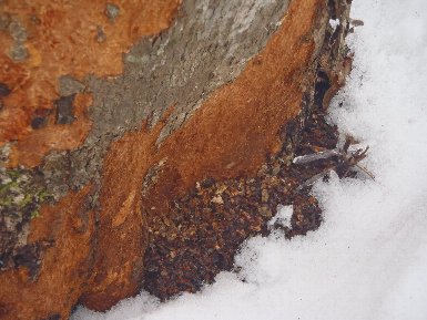 園内は昨日の雪で再び冬景色になってしまいましたが、少しずつとけてはきています。そんな園路の脇で、ネズミが樹皮をかじった痕を発見しました。