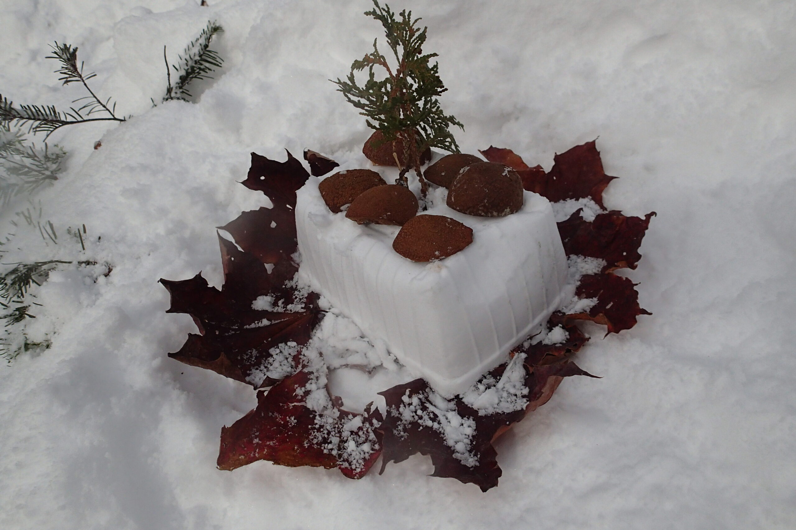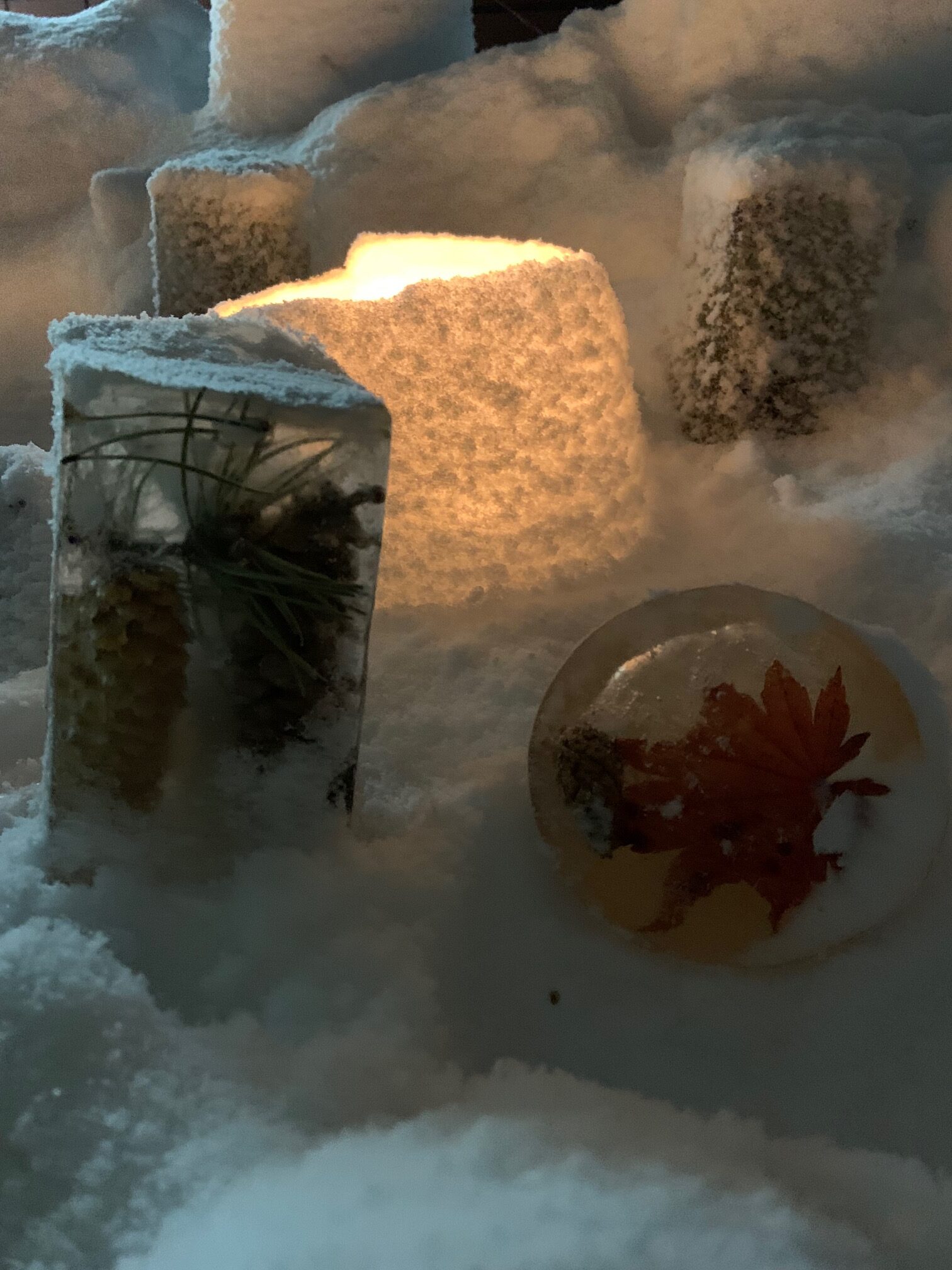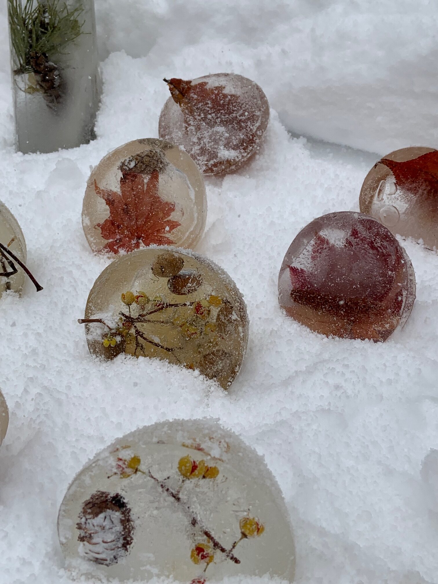 氷の中に落ち葉や木の実を閉じ込めたアイスボールもきれいです。