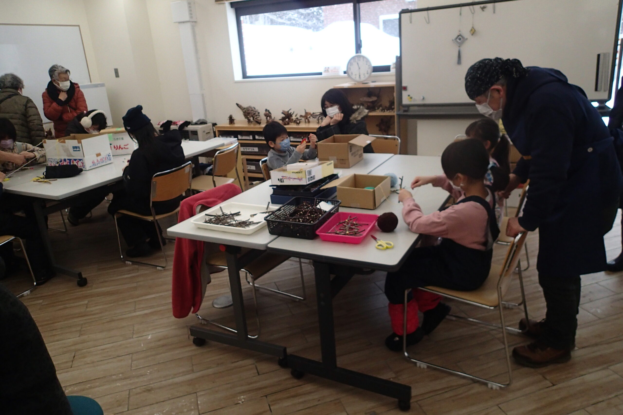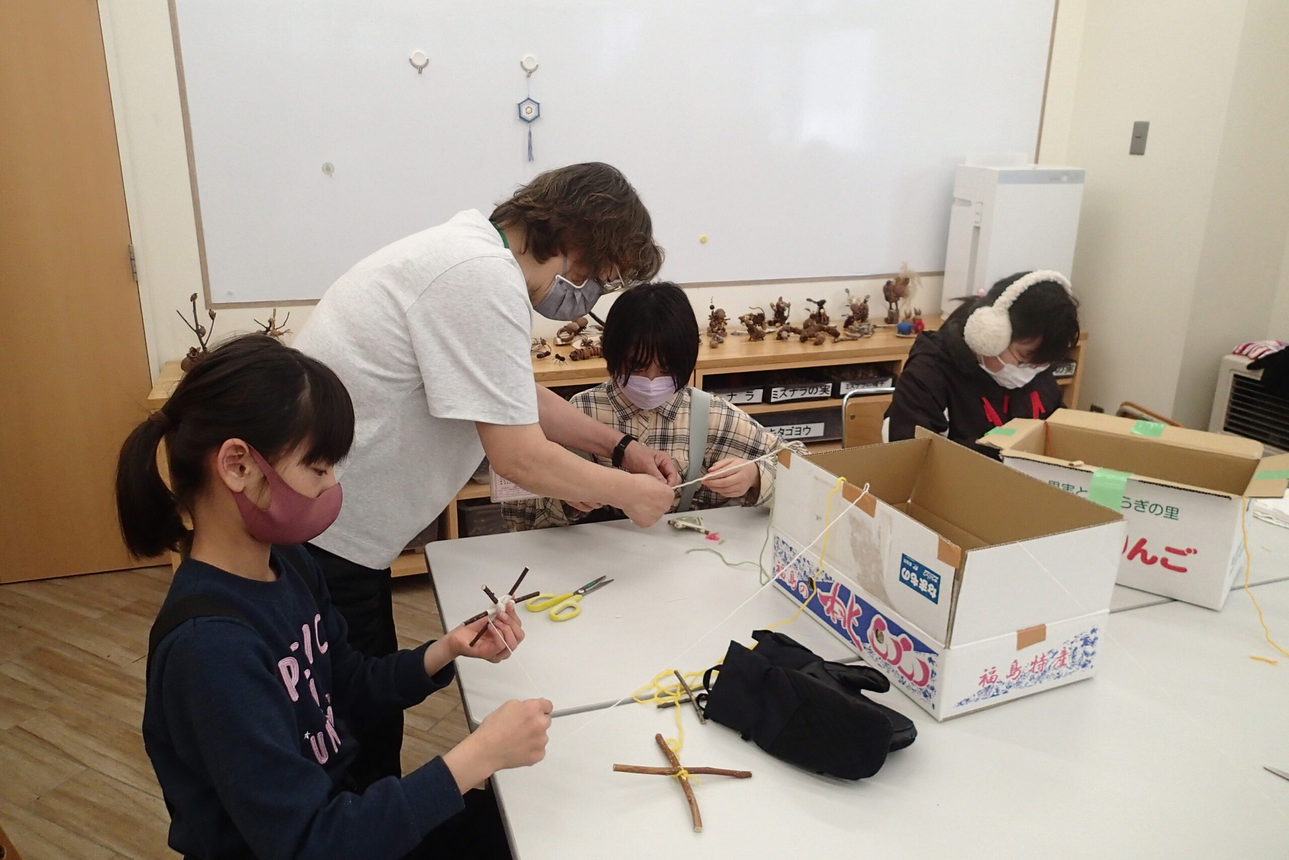 西岡公園のボランティア「森の工作」の皆さんが親切にサポートしてくれました。今回の工作は毛糸と木の枝で作る「雪の結晶」と「ゴッドアイ」でしたよ。みんな上手に作ってくれました。